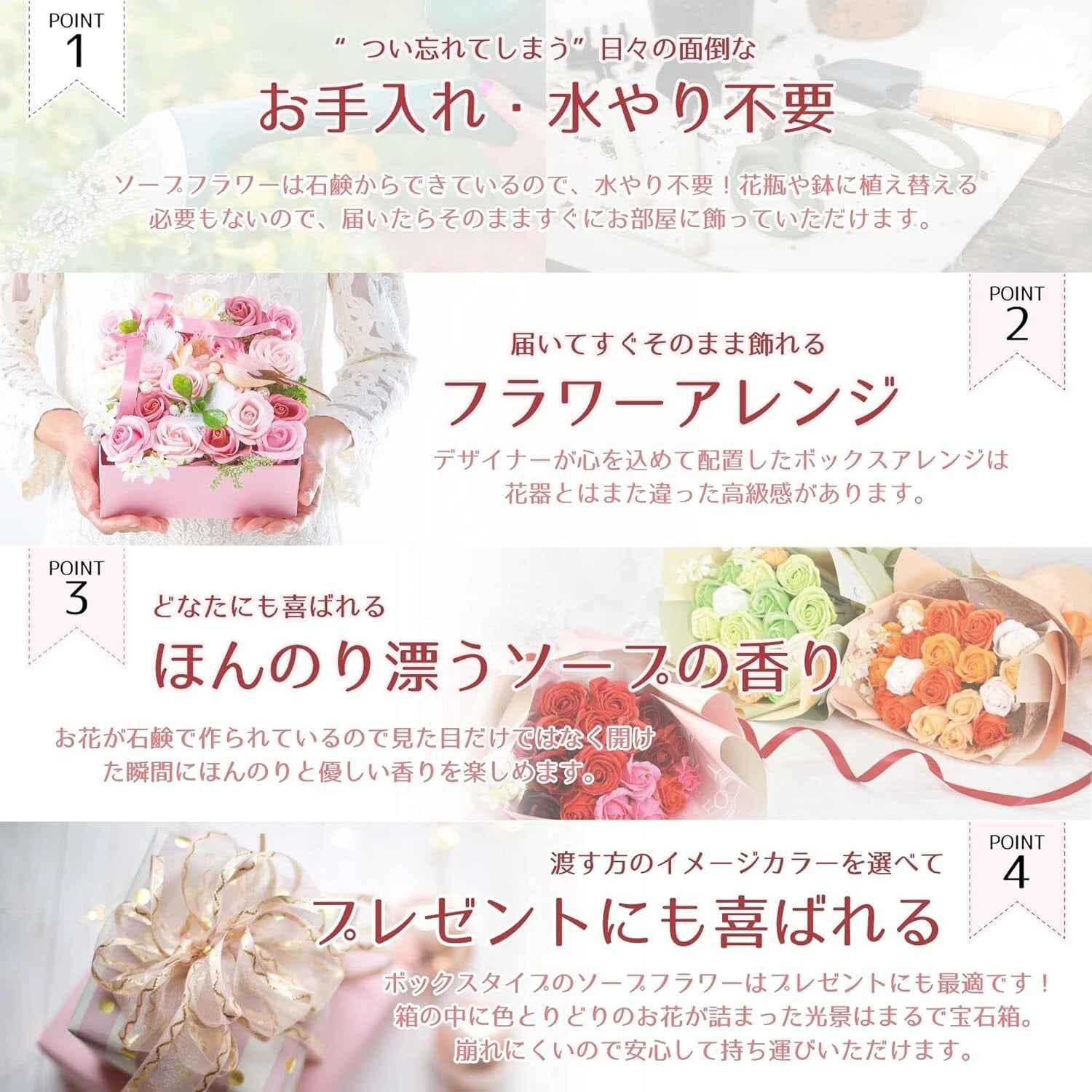 「ソープフラワー」は⽯鹸でできたお花で何の⼿⼊れもいらず枯れることがありません。
