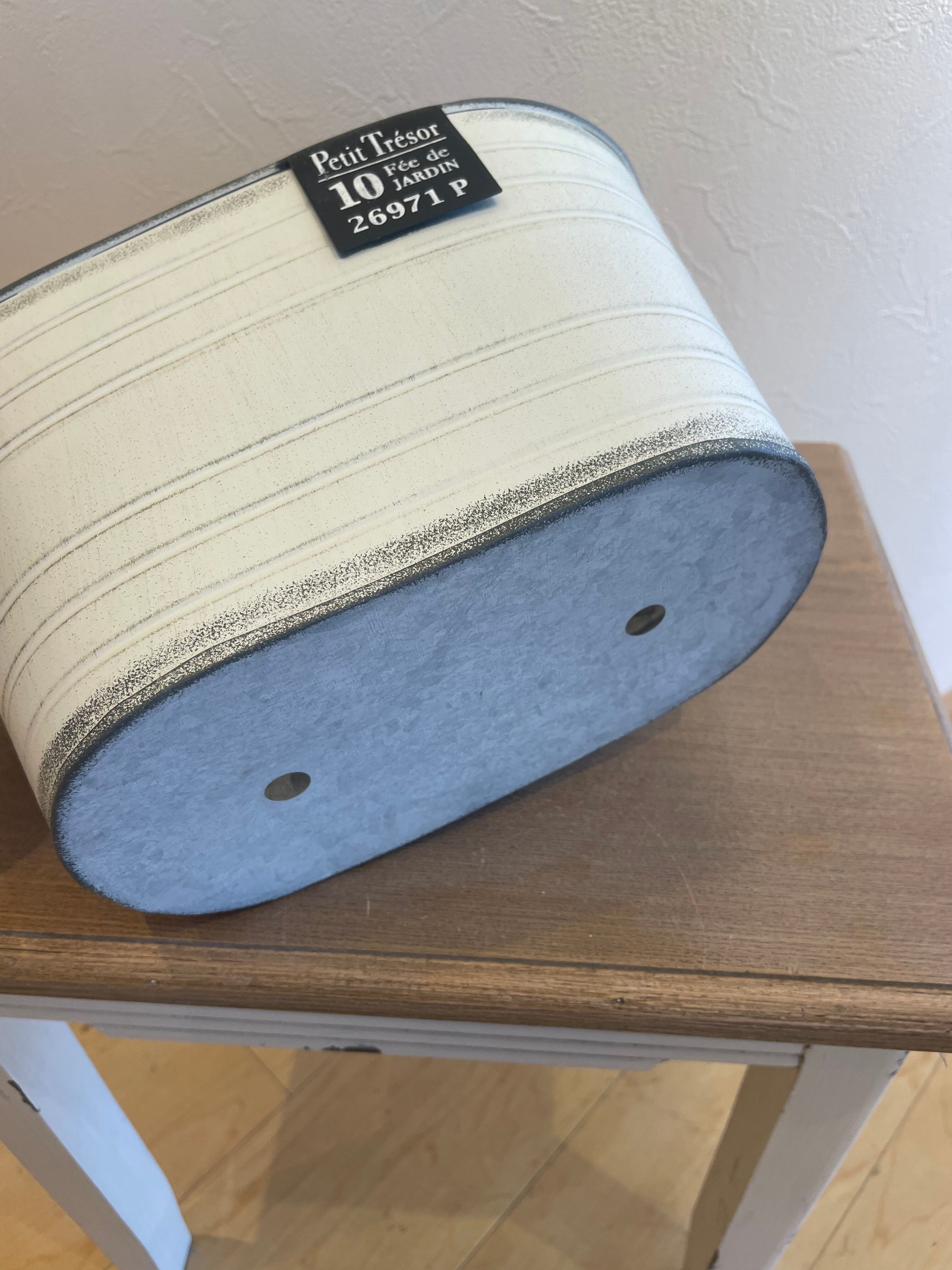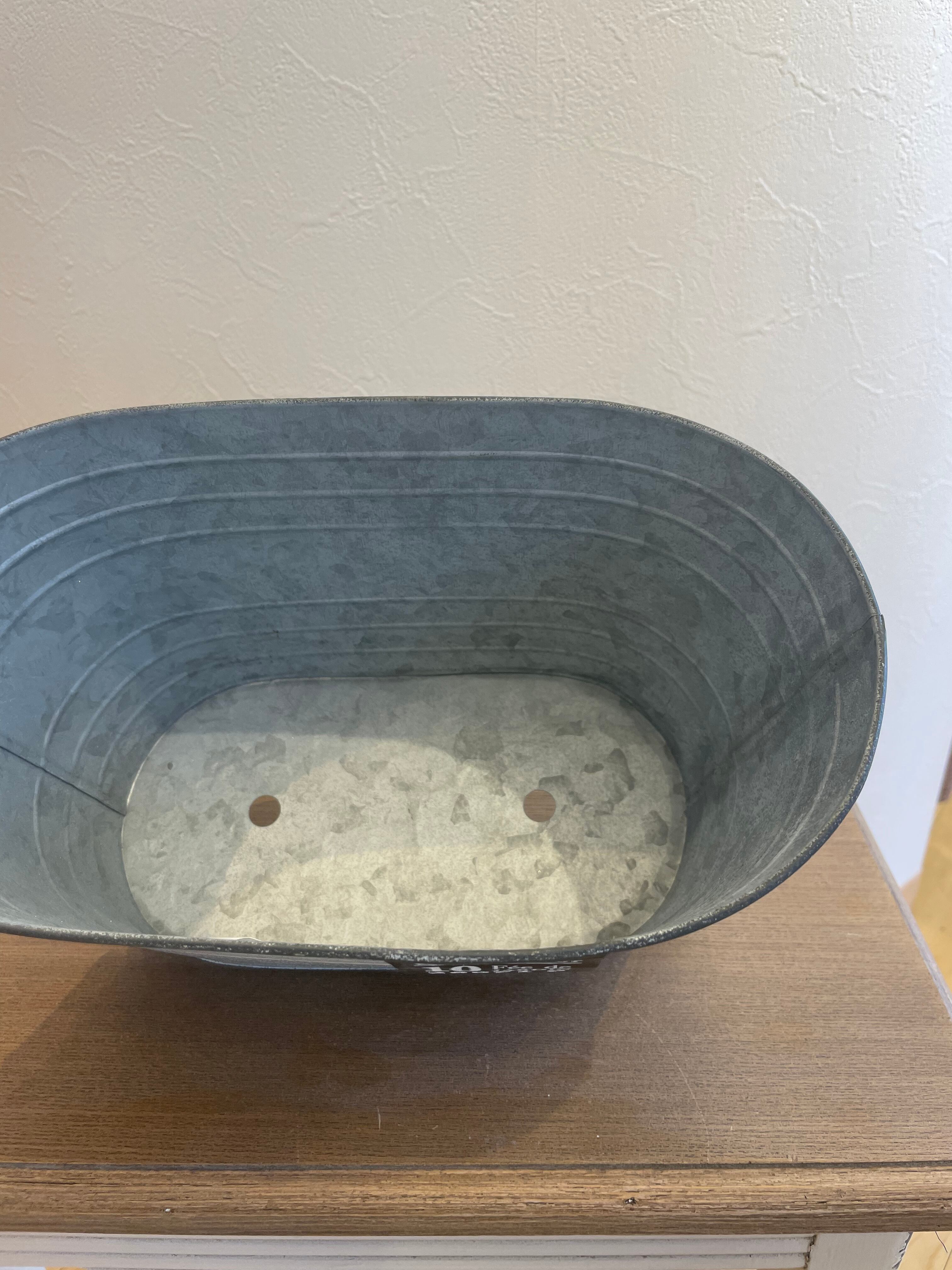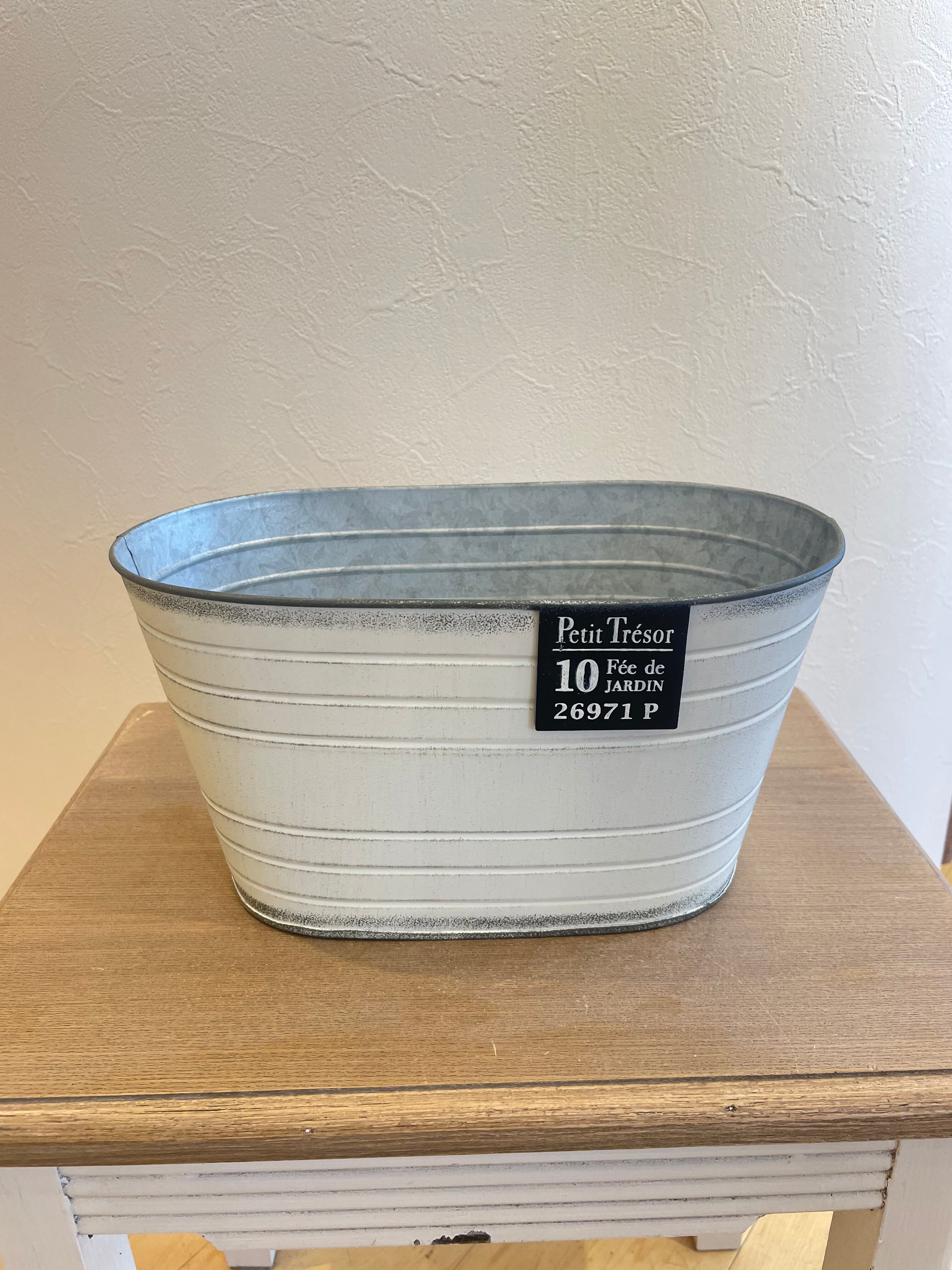 シャビーなアンティーク加工がオシャレなブリキ鉢。ブリキ製のタグがワンポイントのアクセントになっています。