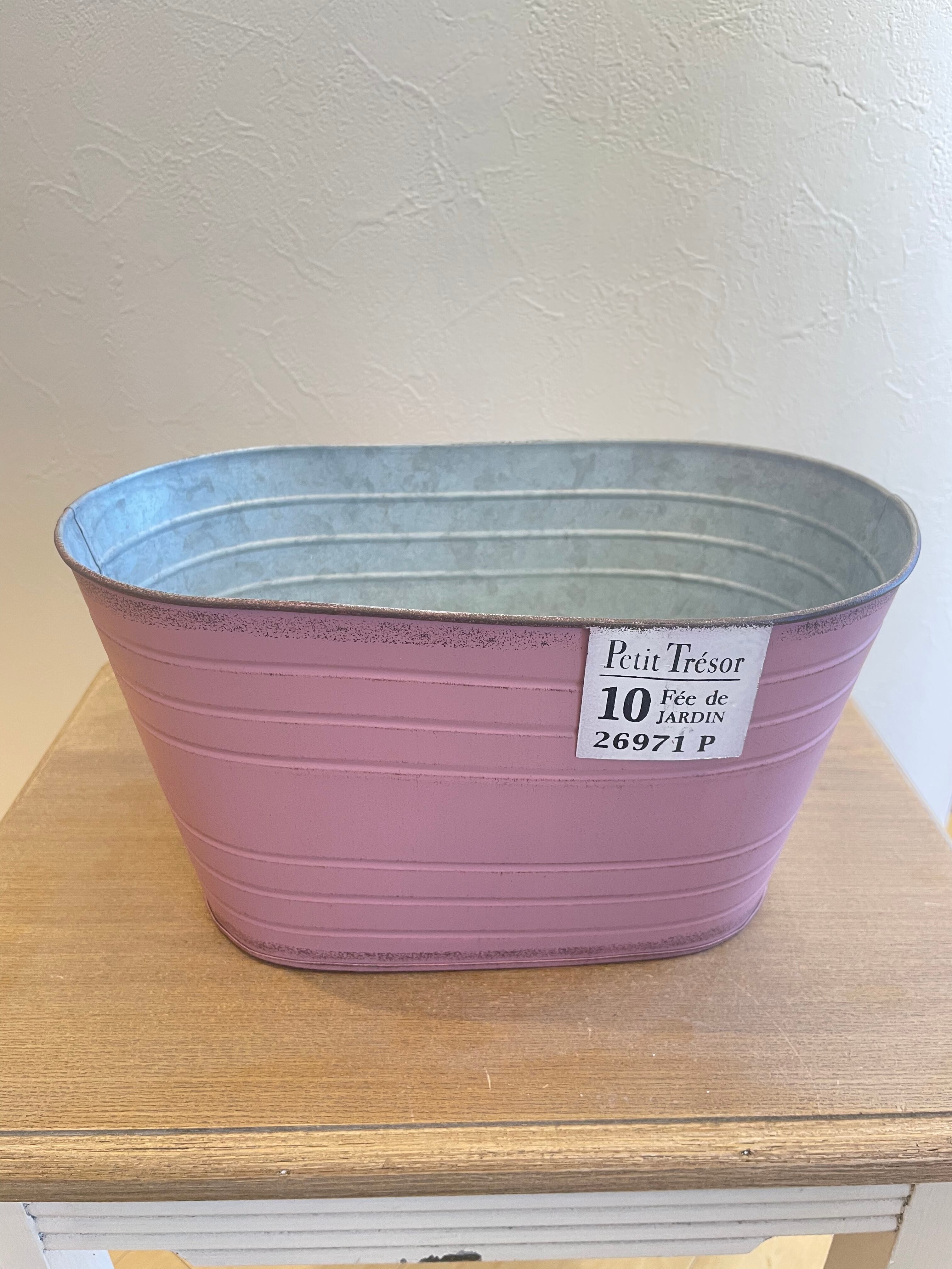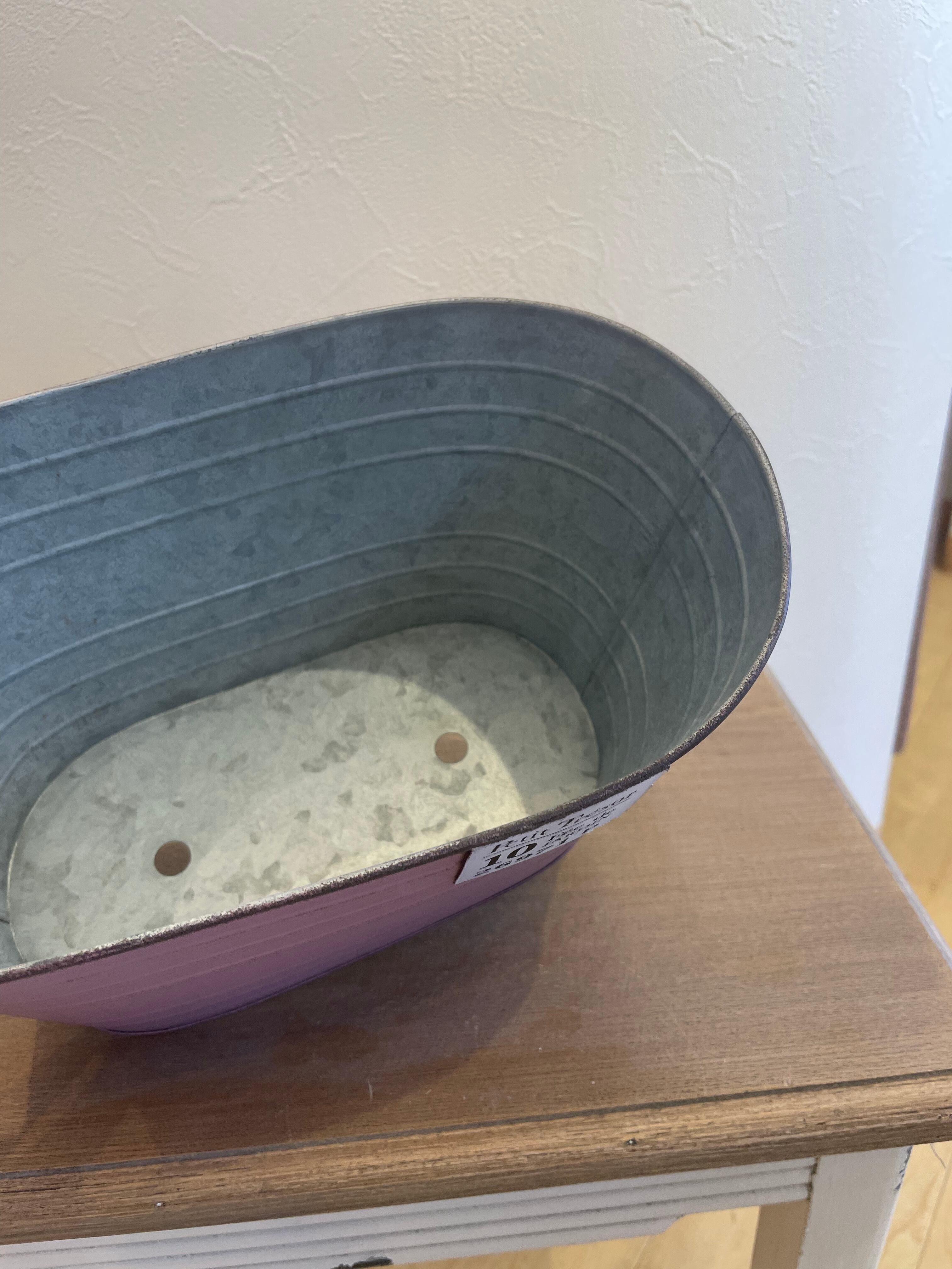シャビーなアンティーク加工がオシャレなブリキ鉢。ブリキ製のタグがワンポイントのアクセントになっています。