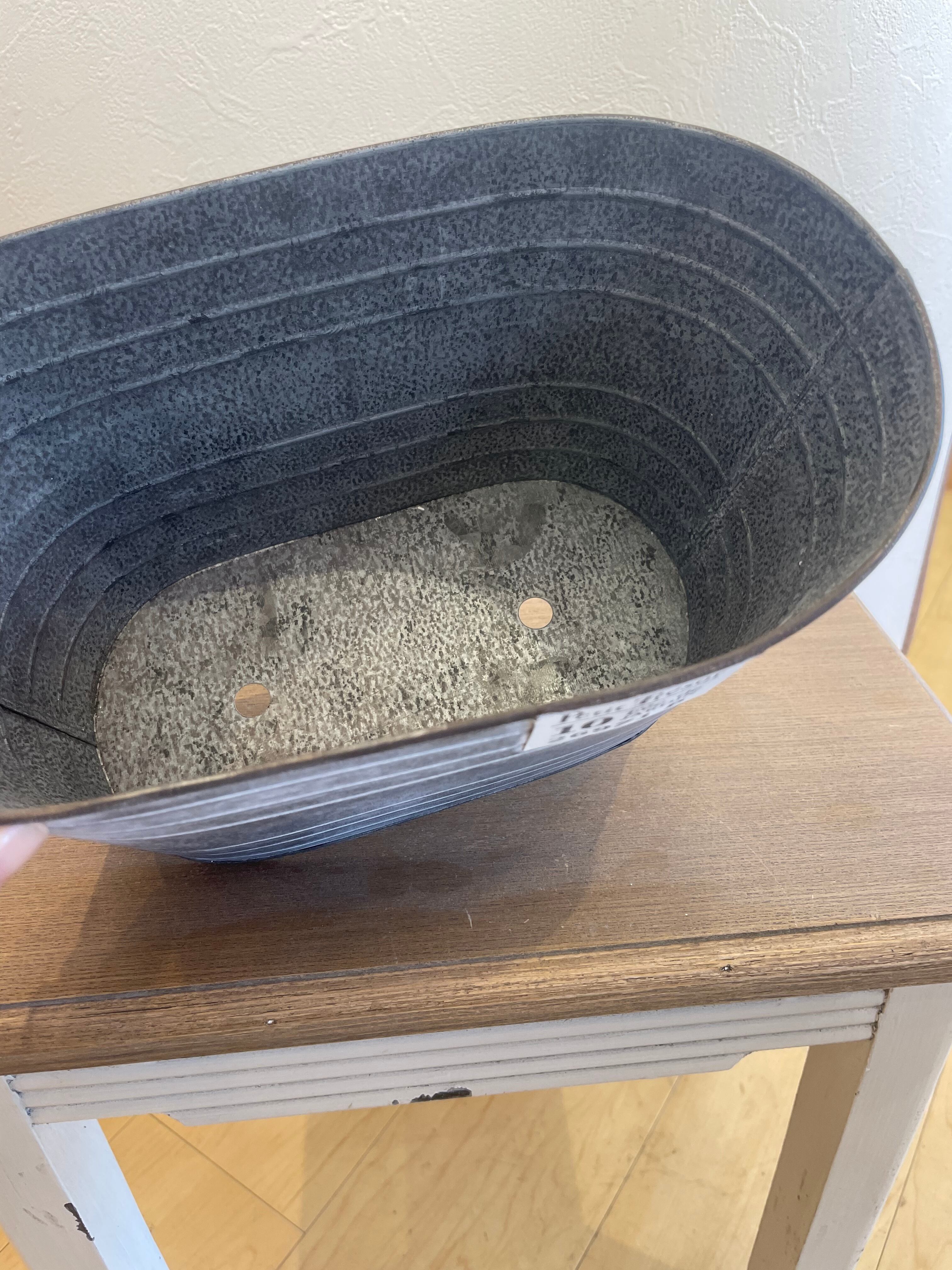シャビーなアンティーク加工がオシャレなブリキ鉢。ブリキ製のタグがワンポイントのアクセントになっています。