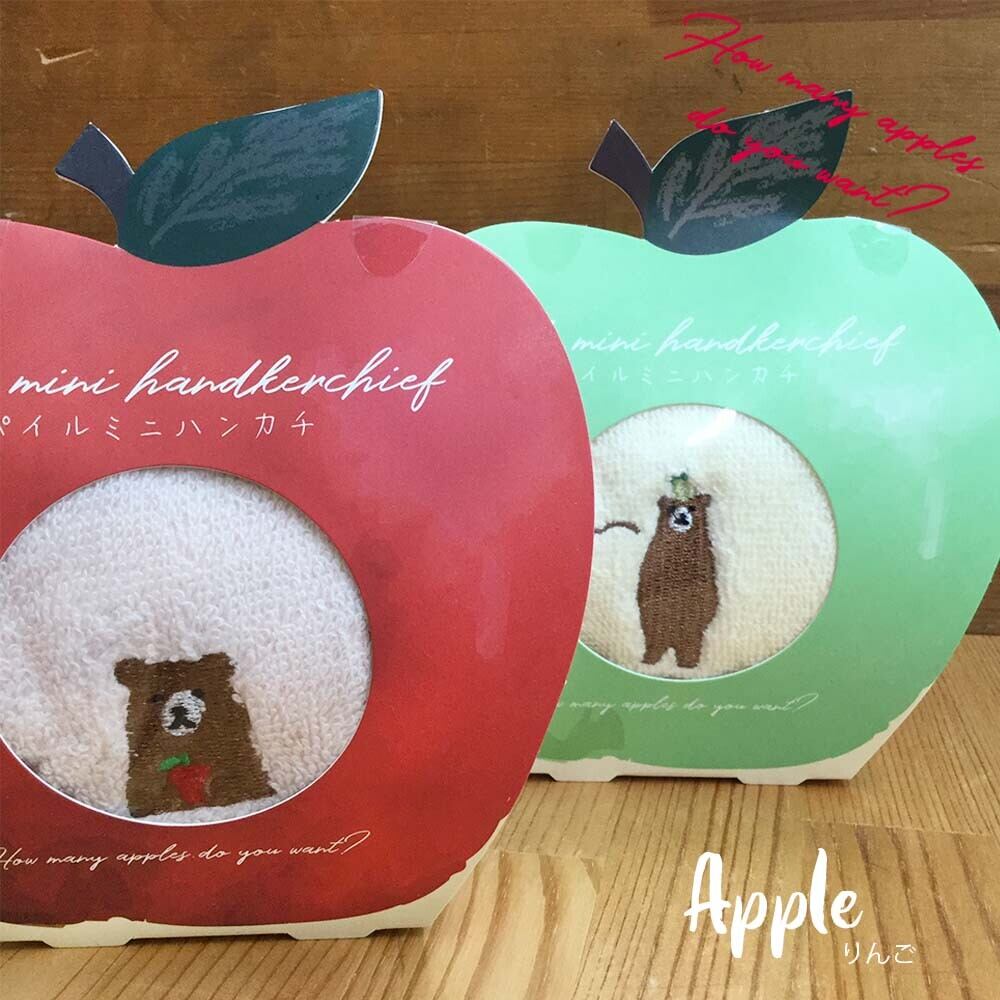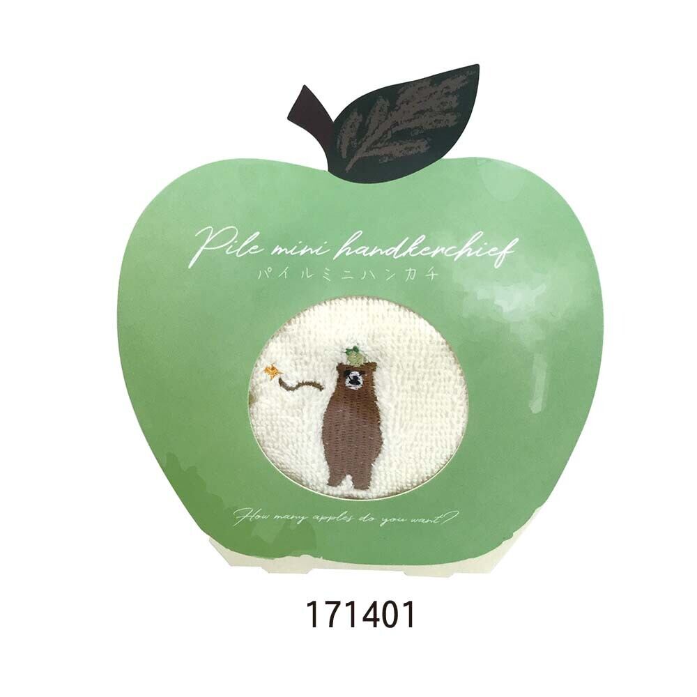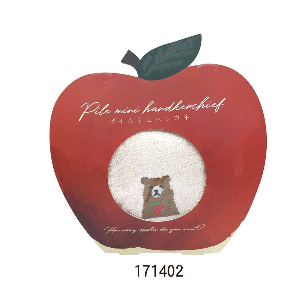 りんごが大好きなクマの刺しゅうのパイルミニハンカチ。ポケットやポーチ、バッグなど、かさばらないコンパクトサイズが魅力的。プレゼントにも最適です◎