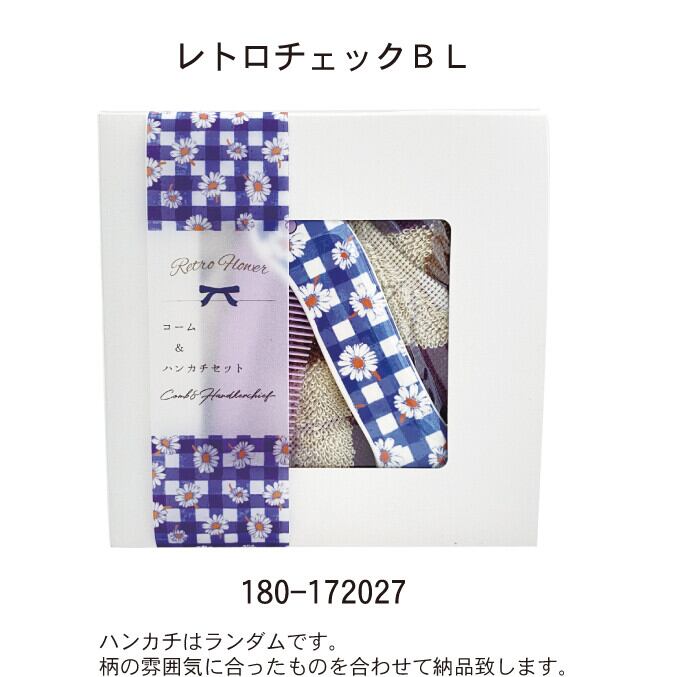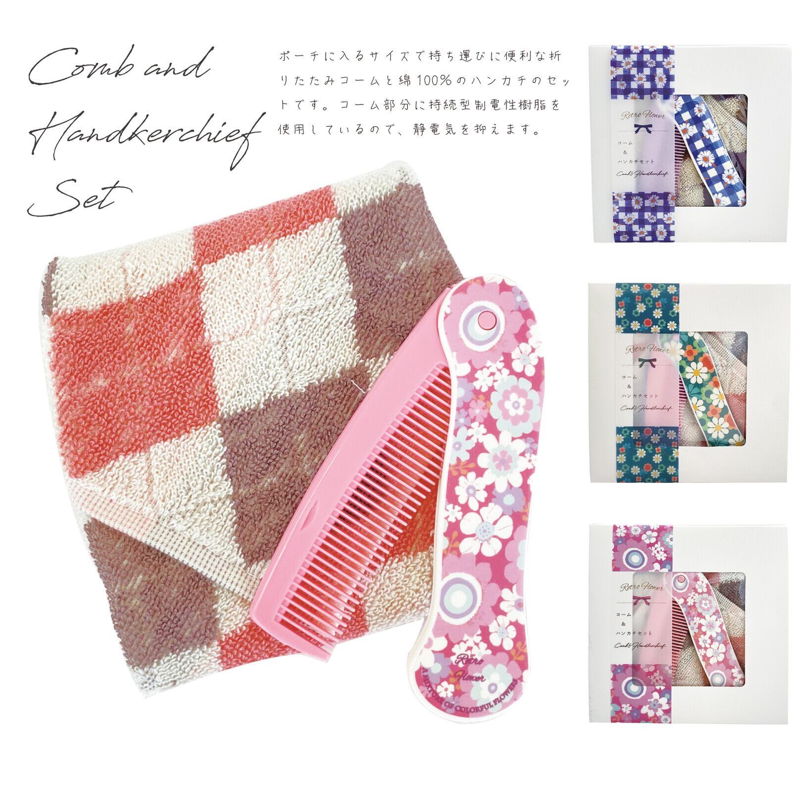 ポーチに入るサイズで持ち運びに便利なレトロ風の折りたたみコームとチェック柄にステッチのアクセントが効いた綿100%のハンカチのセットです。折りたたみコームはコーム部分に持続型制電性樹脂を使用。静電気を抑えます。