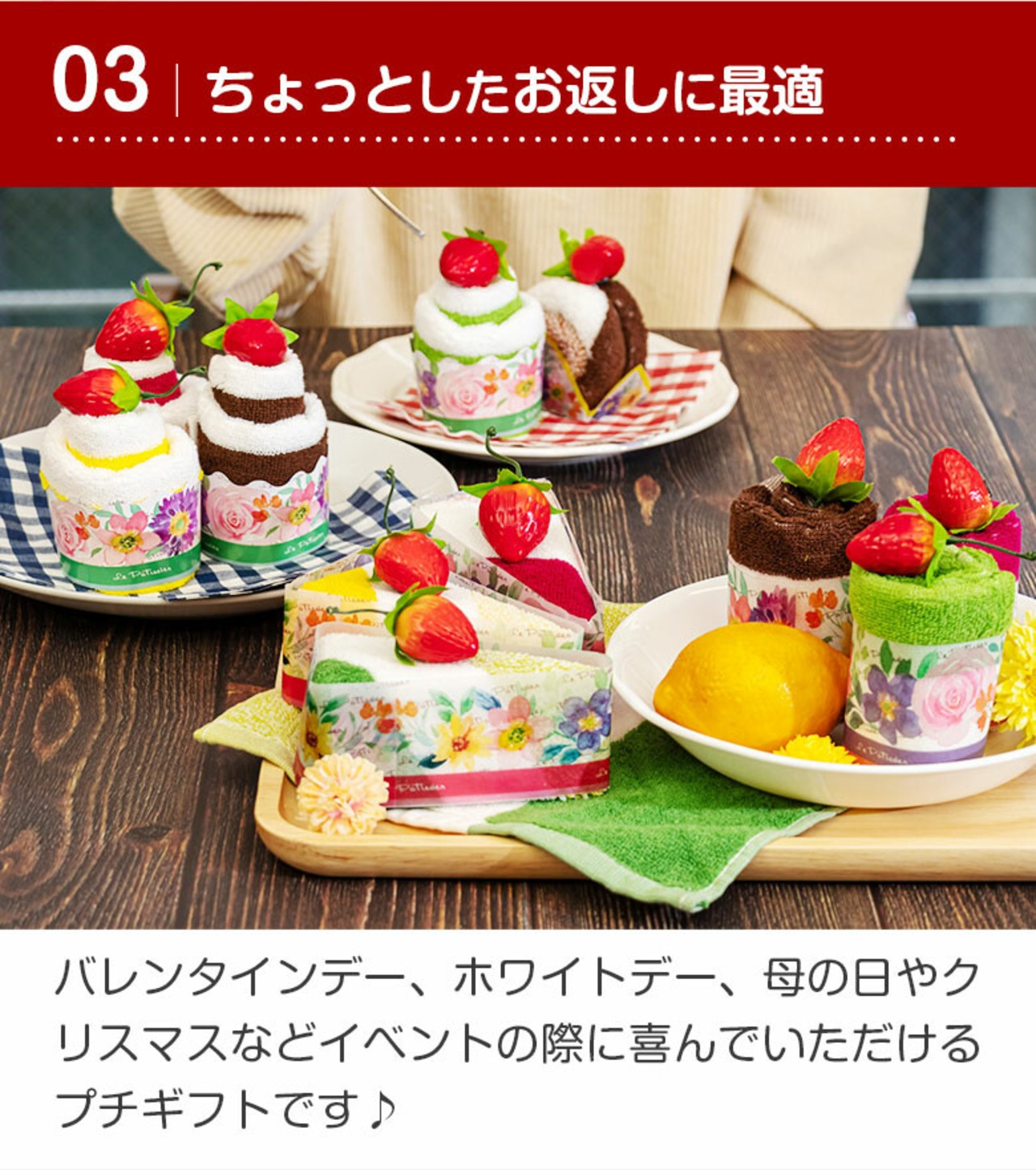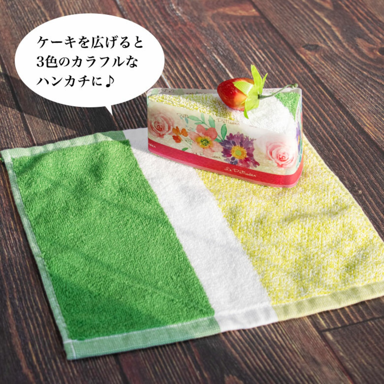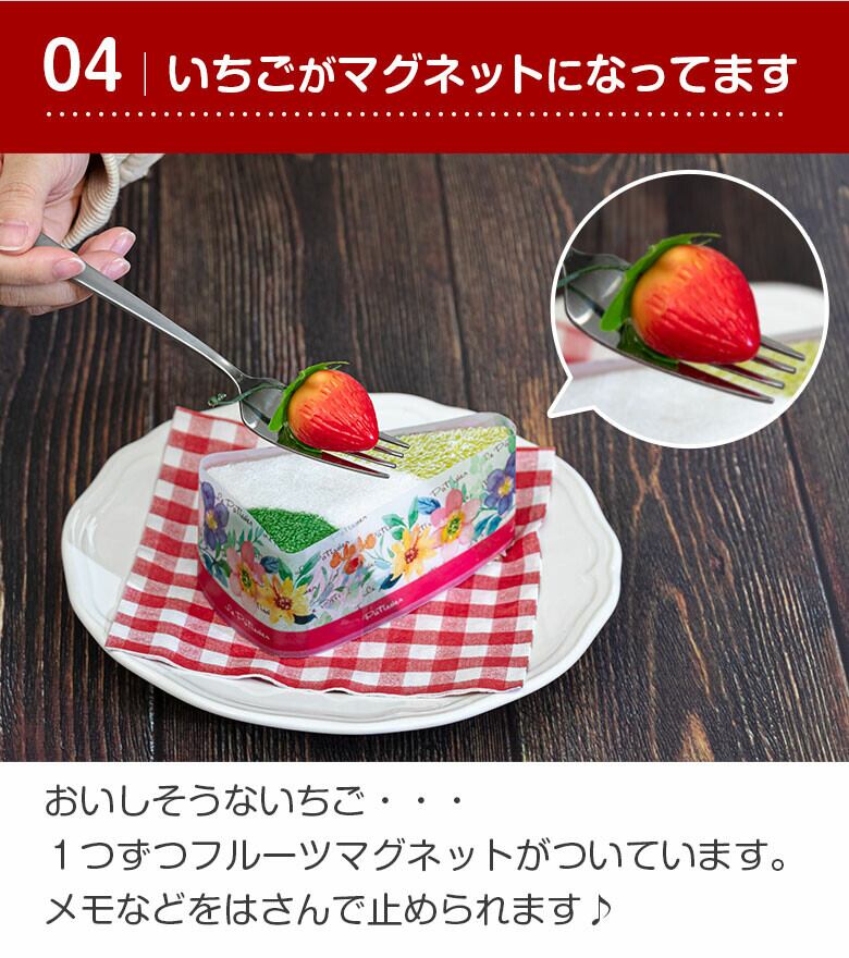 見ておいしい、使って楽しいプチギフトにピッタリなタオルでできたケーキです。実はこのケーキ、ディテールにこだわって本物そっくりに作られたタオルのケーキなんです。ケーキ生地はふわふわ柔らかな手触りのタオルハンカチ。ケーキを飾るイチゴは、マグネット付きマスコット。厳選した素材を1つ1つ丁寧に、ハンドメイドで仕上げています。