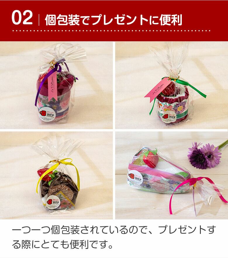 見ておいしい、使って楽しいプチギフトにピッタリなタオルでできたケーキです。実はこのケーキ、ディテールにこだわって本物そっくりに作られたタオルのケーキなんです。ケーキ生地はふわふわ柔らかな手触りのタオルハンカチ。ケーキを飾るイチゴは、マグネット付きマスコット。厳選した素材を1つ1つ丁寧に、ハンドメイドで仕上げています。