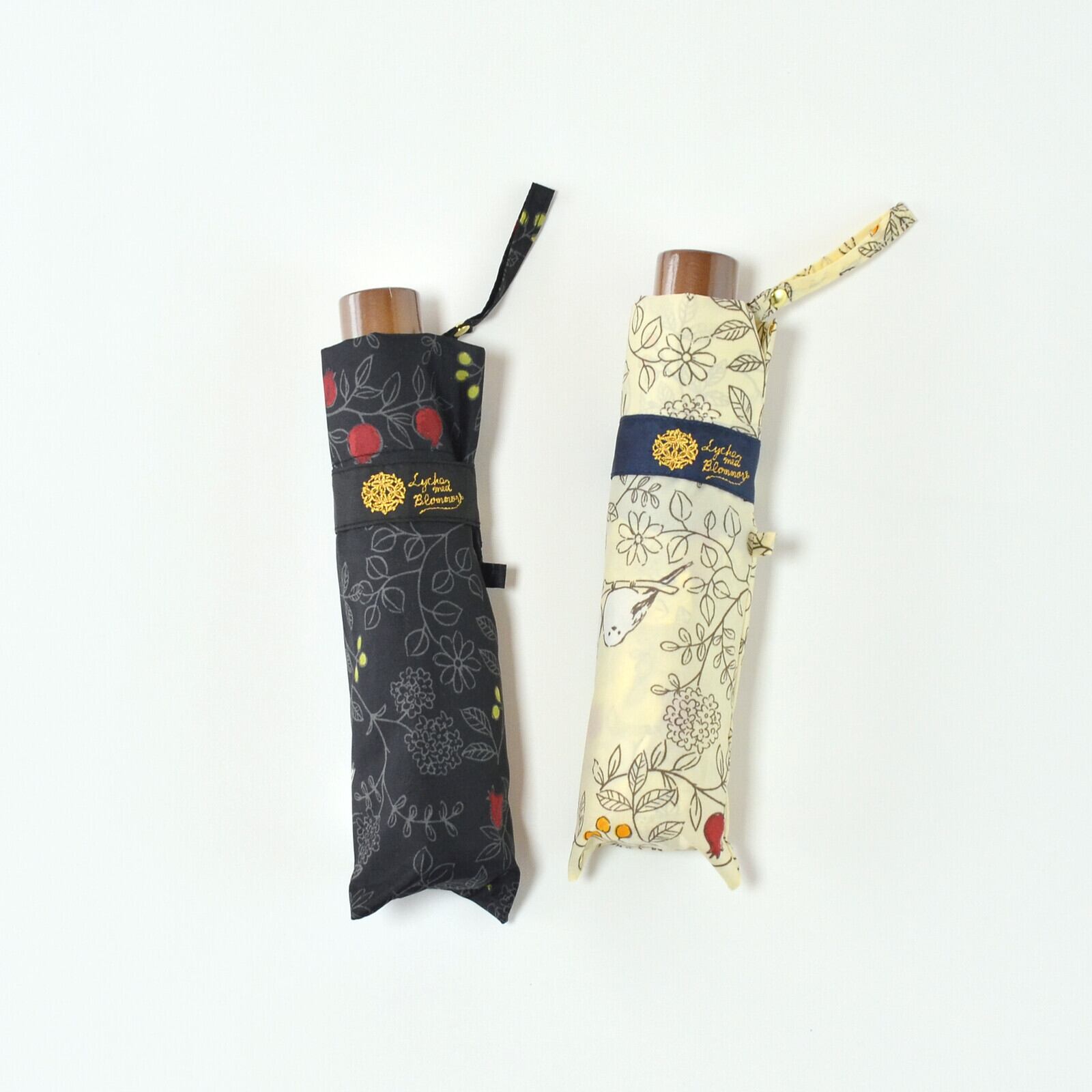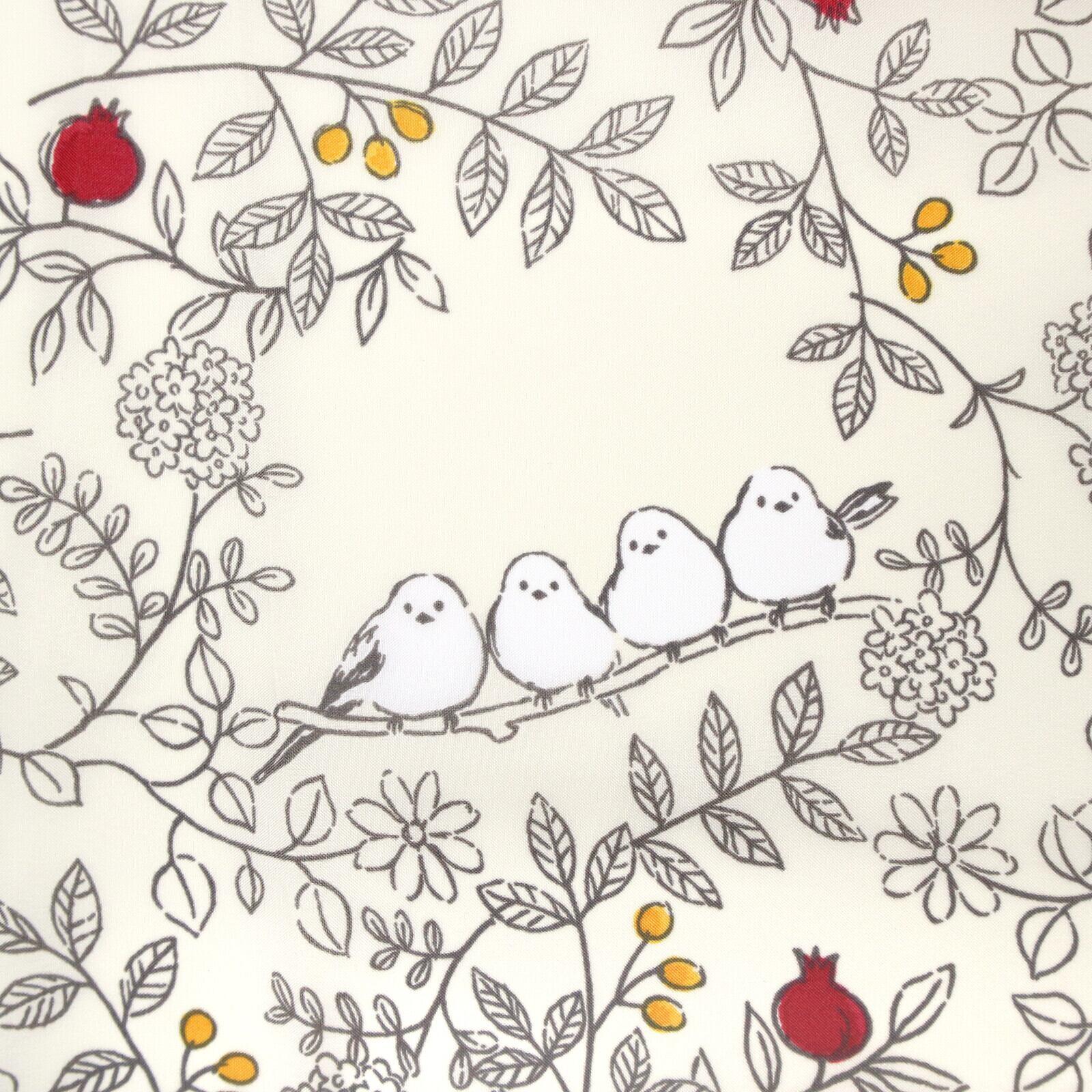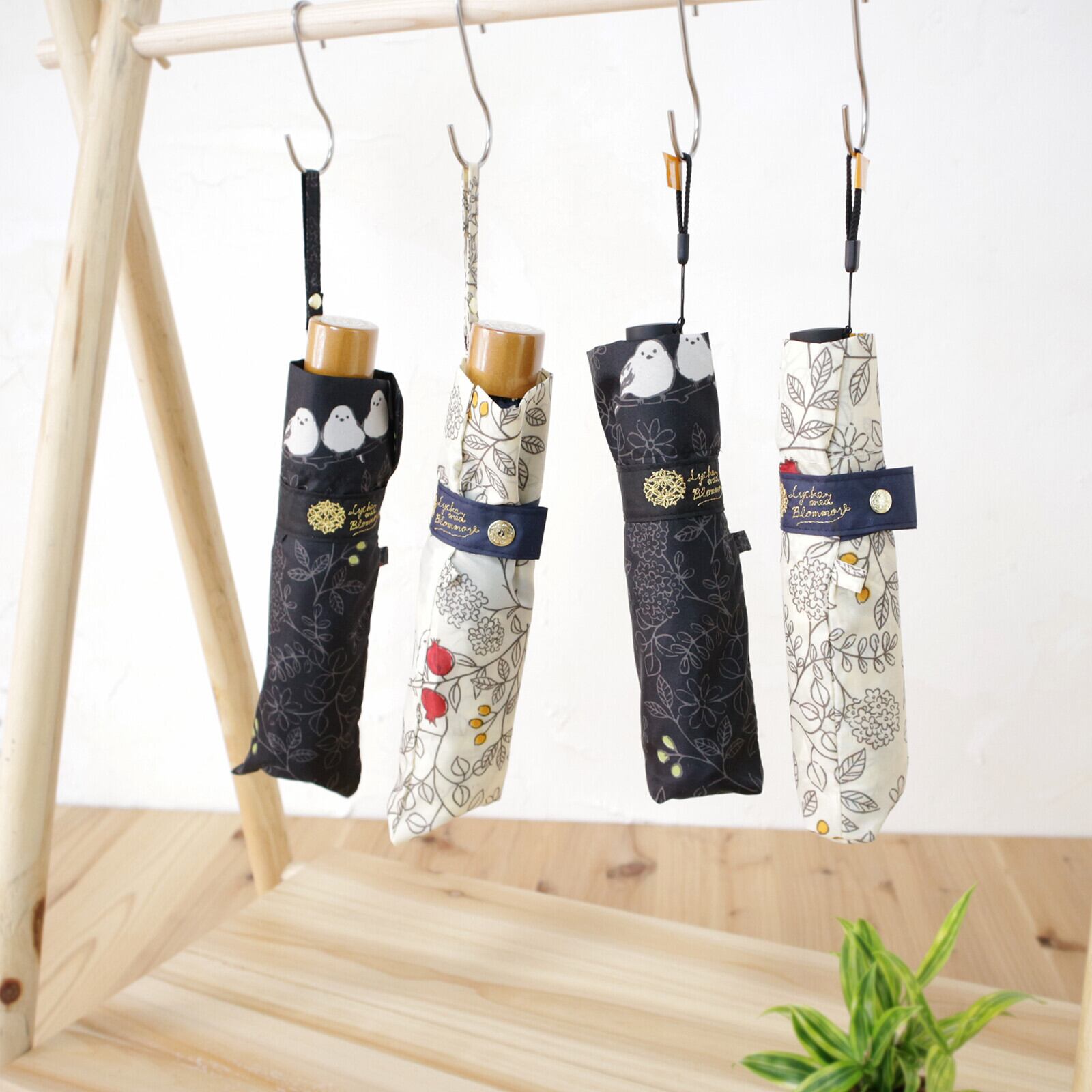 雪の妖精「シマエナガ」と赤いザクロの総柄プリントの大人かわいい雨傘。木の枝に団子になったシマエナガさん達がとってもキュート。共袋のネームバンドには、シリーズ共通の金糸の花モチーフ刺繍&花モチーフのホックボタン付き。贈り物にぴったりなメッセージタグも付いています。