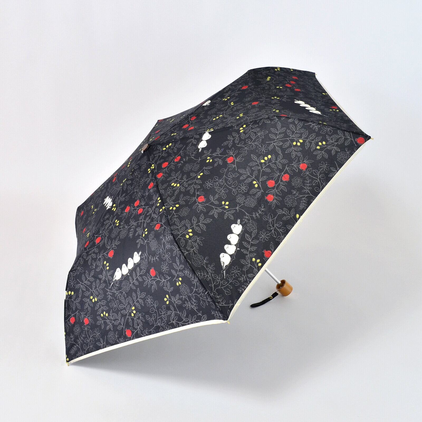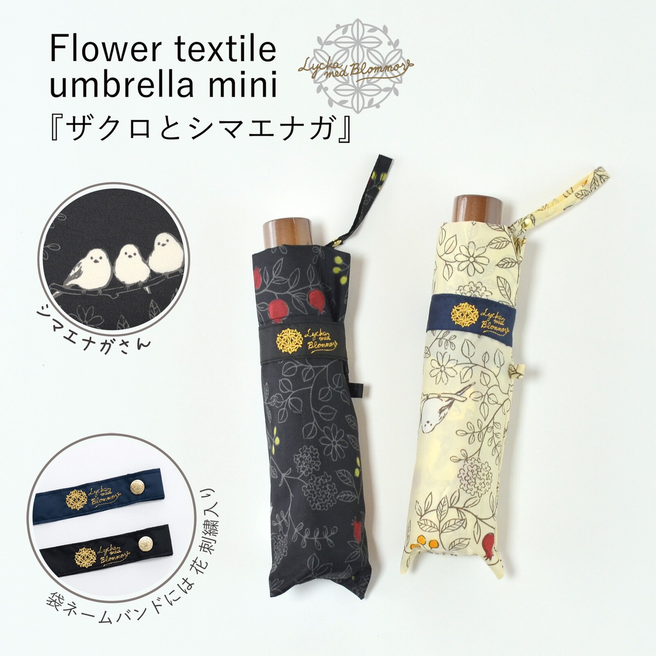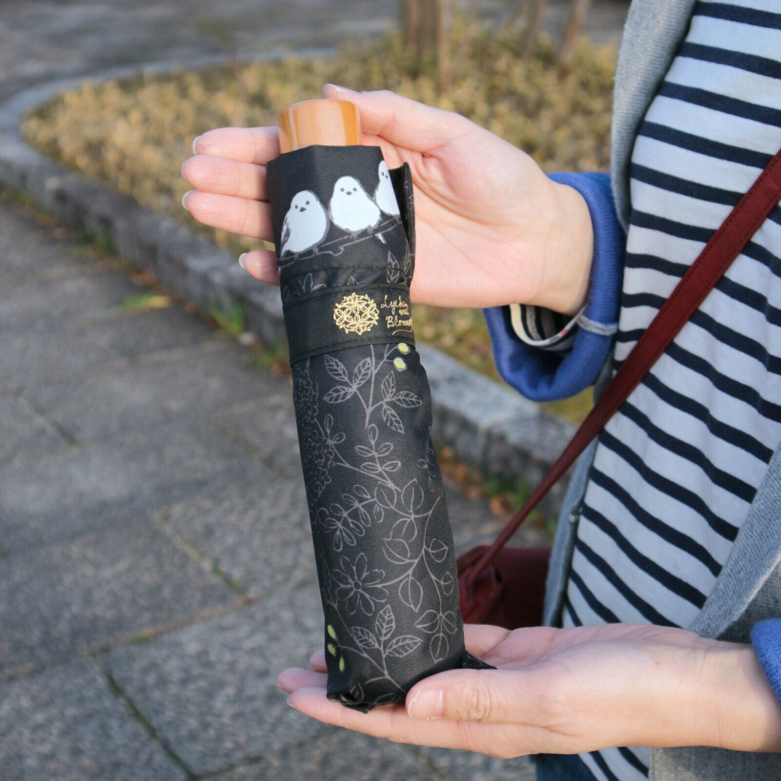 雪の妖精「シマエナガ」と赤いザクロの総柄プリントの大人かわいい雨傘。木の枝に団子になったシマエナガさん達がとってもキュート。共袋のネームバンドには、シリーズ共通の金糸の花モチーフ刺繍&花モチーフのホックボタン付き。贈り物にぴったりなメッセージタグも付いています。