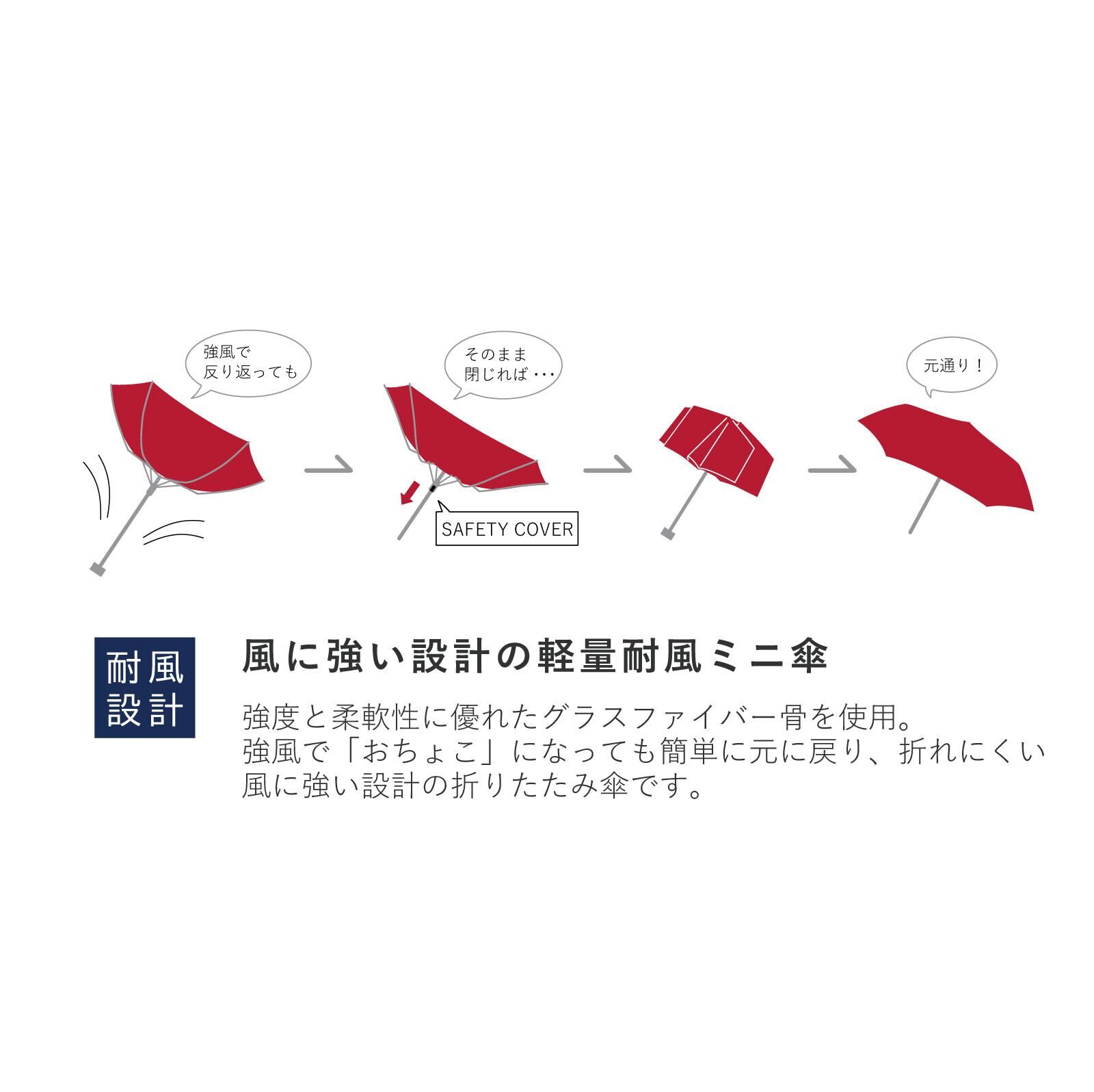 強度と柔軟性に優れたガラス繊維強化プラスチック「グラスファイバー骨」を使用。強風で「おちょこ」になっても簡単に元に戻り、折れにくい風に強い設計。親骨をポキポキ折らずとも簡単に開閉ができる折りたたみ傘です。 傘を閉じる際に爪や指を挟まないよう、ボタン式の安全ろくろ付き。55cmと少し大きめサイズなので、突然の雨でも安心です。