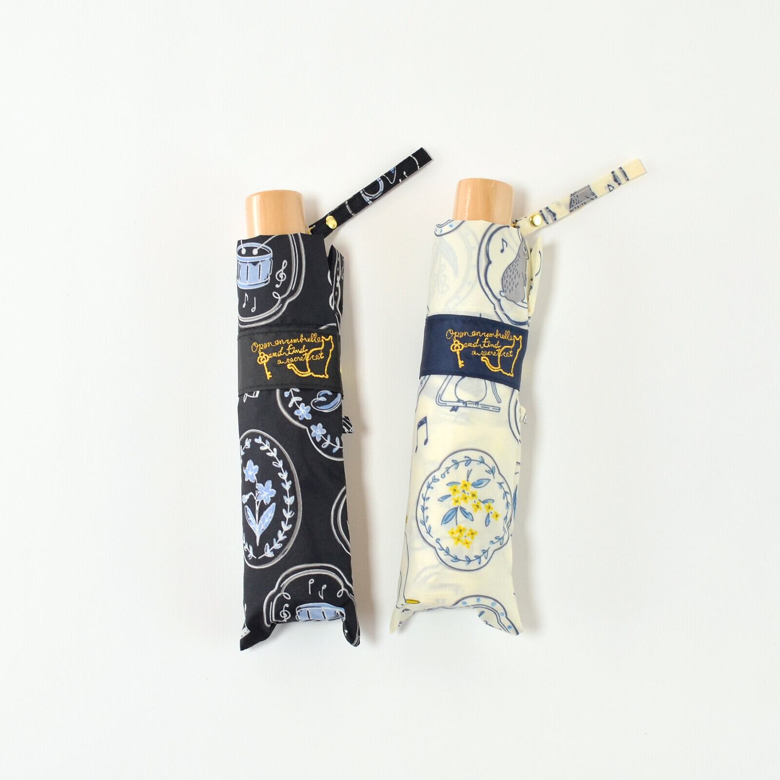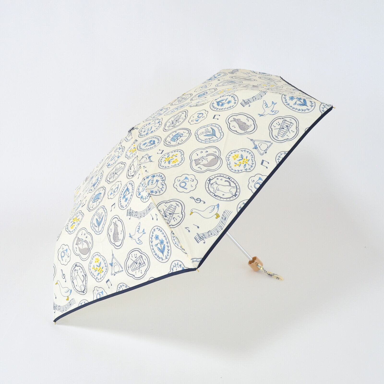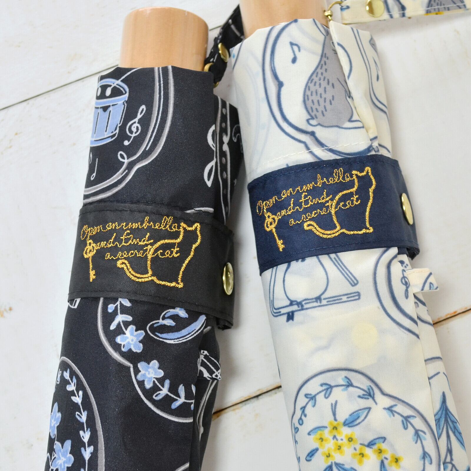 ホルンや木琴などの楽器モチーフと、ごろんとくつろぐ猫ちゃんやうさぎ、あひるやシマエナガの動物さん達のプリントがかわいい雨傘です。共袋のネームバンドには金糸のシリーズ共通の金糸の猫刺繍&猫のあしあとホックボタン付きになっていて、猫好きさんにおすすめ!ハンドルはコンパクトなねじ式の木製で「猫います」シール付き。バッグにも収納しやすい形です。贈り物にぴったりなメッセージタグも付いています。
