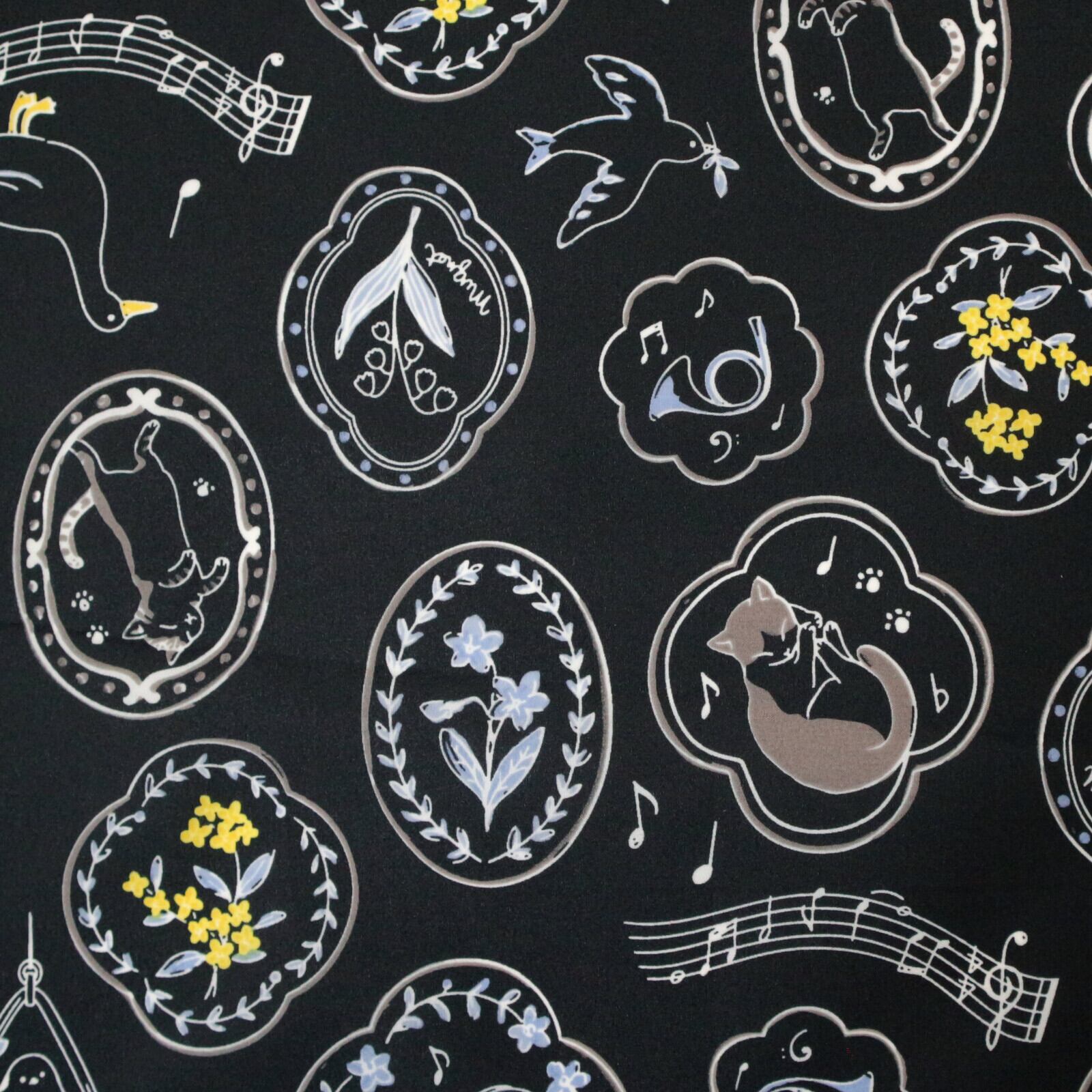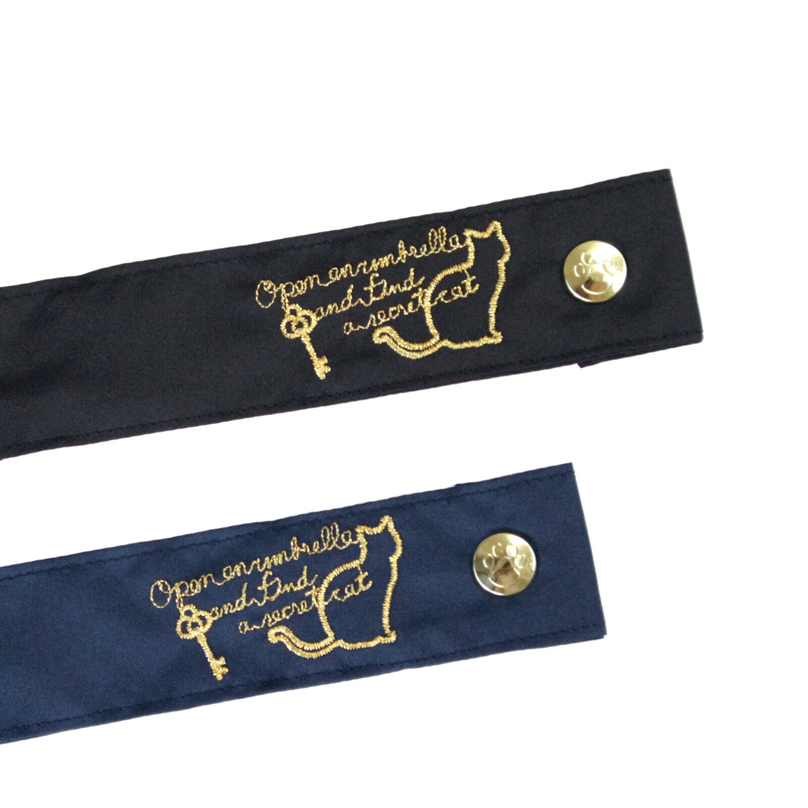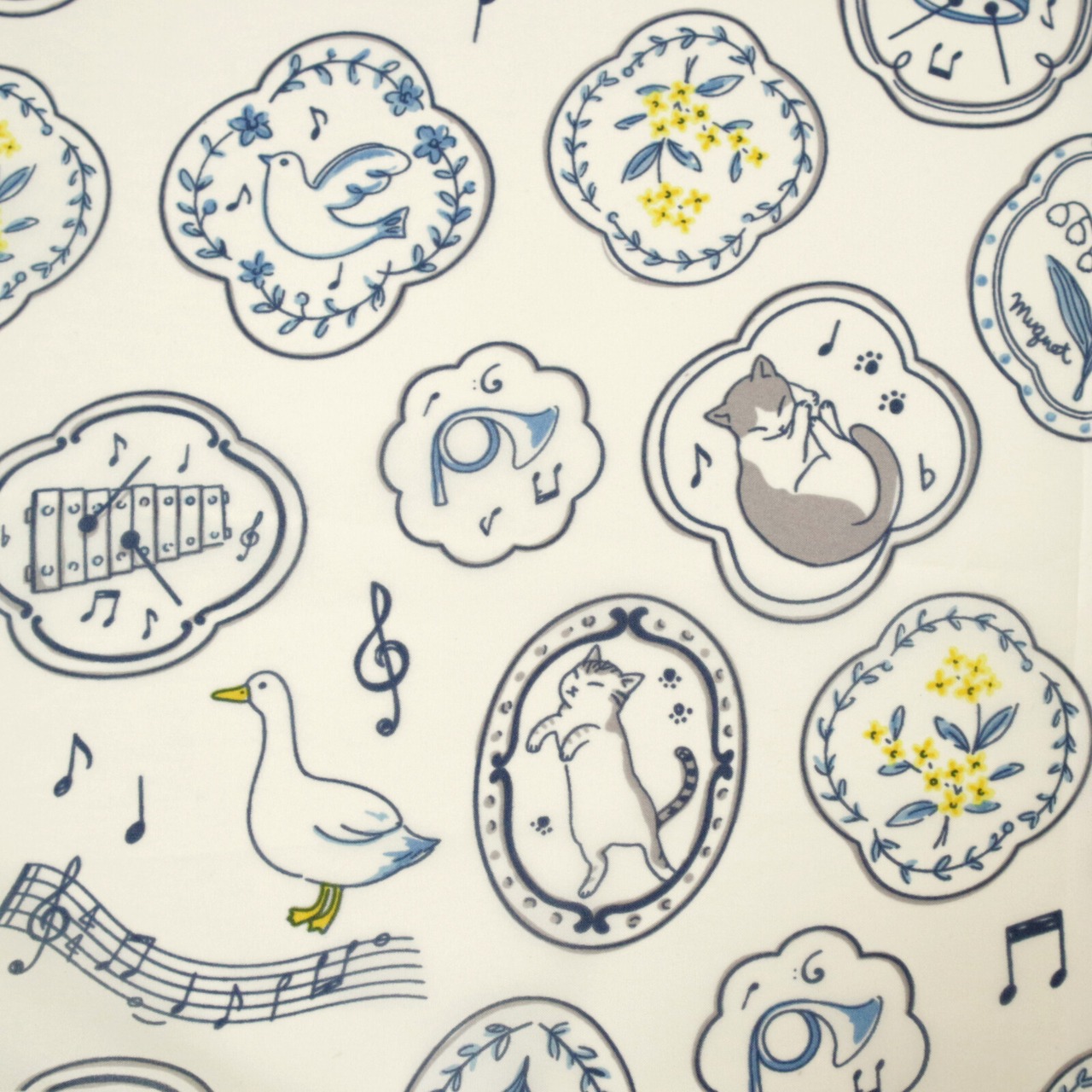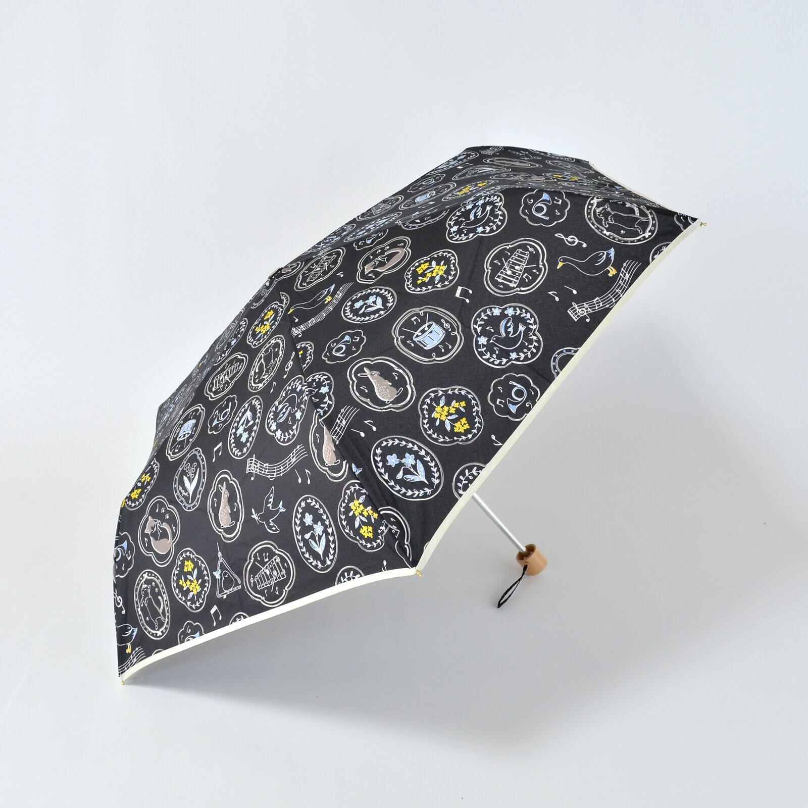 ホルンや木琴などの楽器モチーフと、ごろんとくつろぐ猫ちゃんやうさぎ、あひるやシマエナガの動物さん達のプリントがかわいい雨傘です。共袋のネームバンドには金糸のシリーズ共通の金糸の猫刺繍&猫のあしあとホックボタン付きになっていて、猫好きさんにおすすめ!ハンドルはコンパクトなねじ式の木製で「猫います」シール付き。バッグにも収納しやすい形です。贈り物にぴったりなメッセージタグも付いています。
