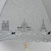 猫フェイスの型抜きヒートカット加工の裾スカラップがかわいい、人気の猫モチーフの裏ブラックコーティングの晴雨兼用傘。対面2コマにはパリの名所を巡る猫ちゃんをプリントしました! ネームバンドには猫の足あとの型押しボタン付き。持ちやすい太さの木製ハンドルには猫の焼き印付き&「猫います」シールもついてます!