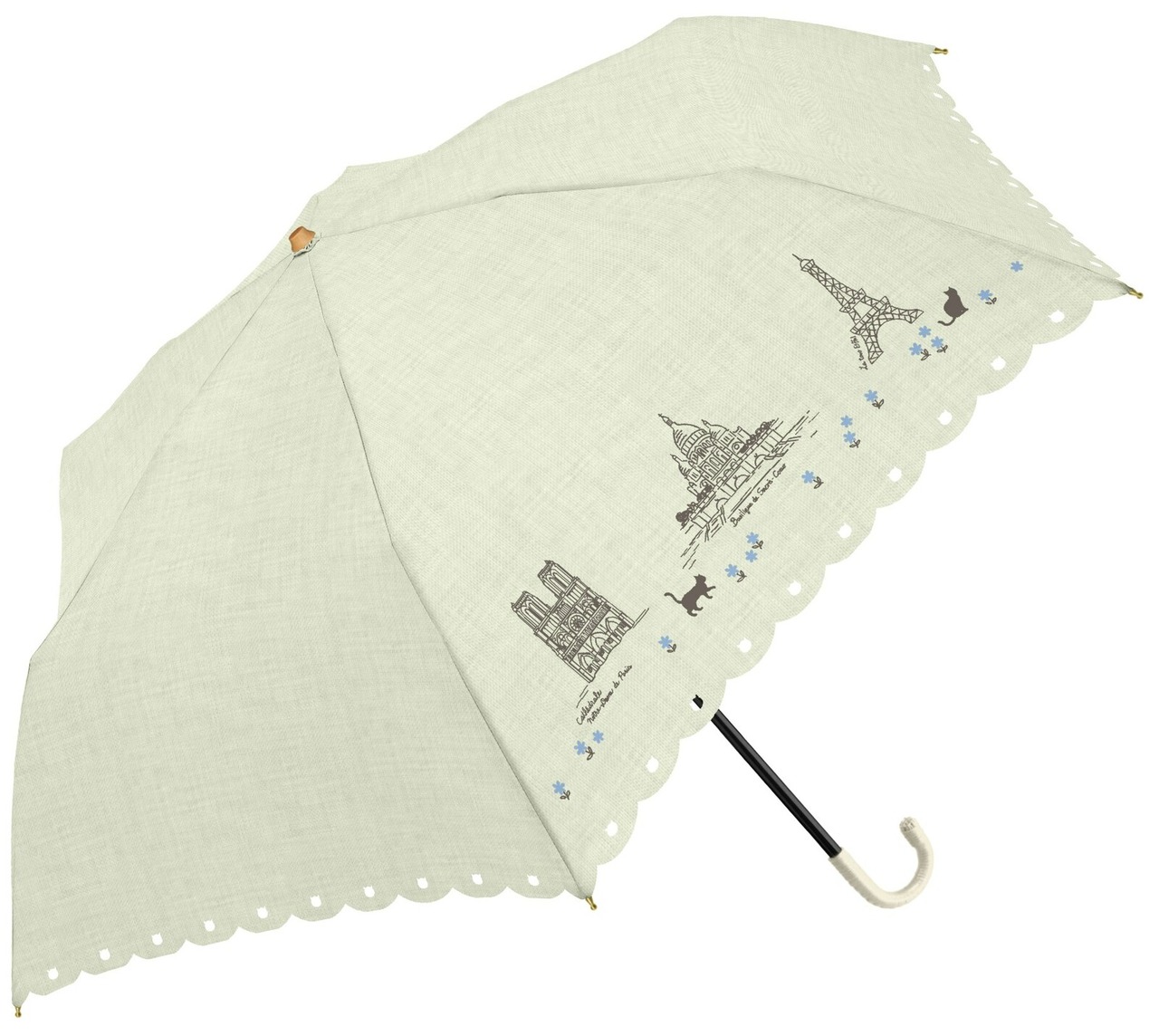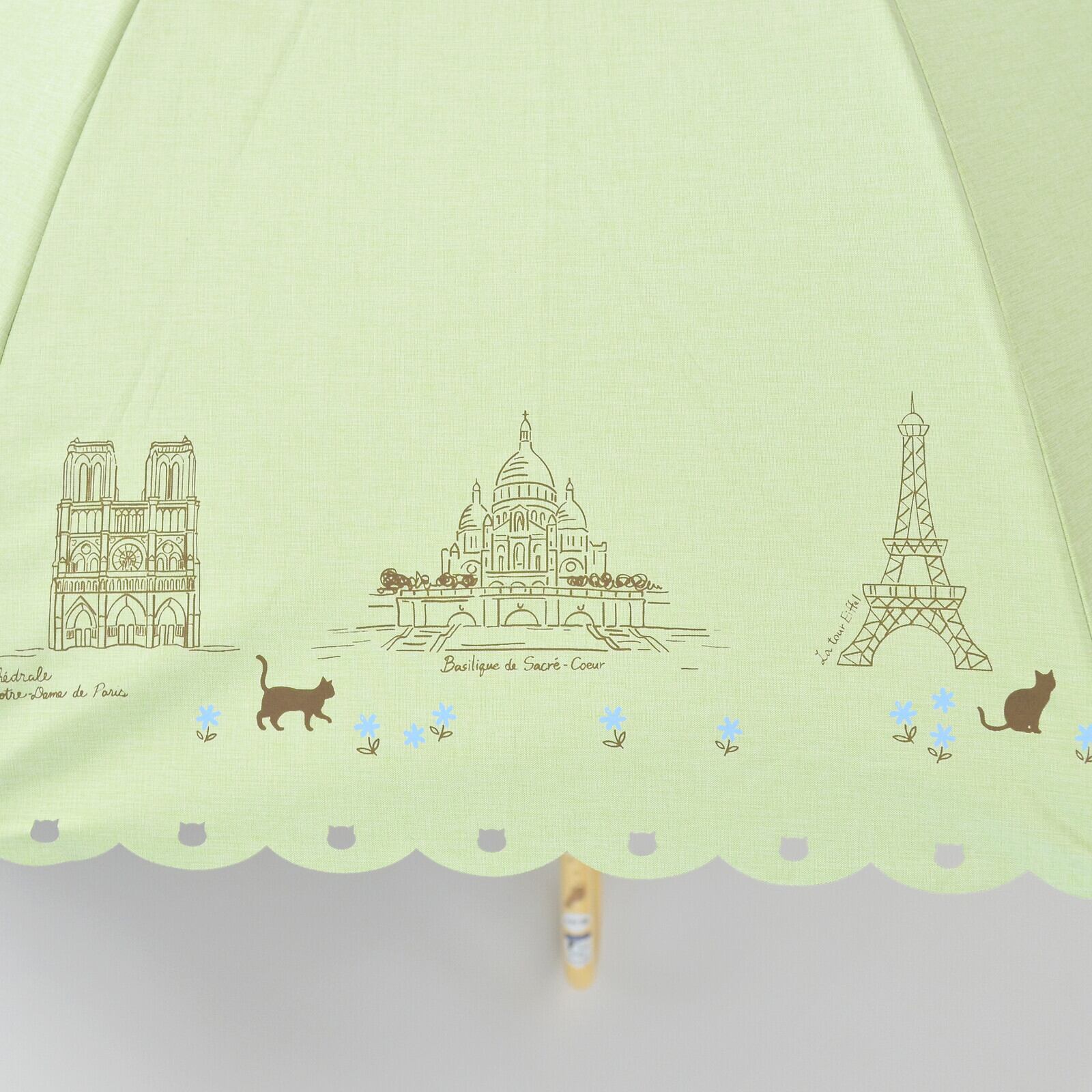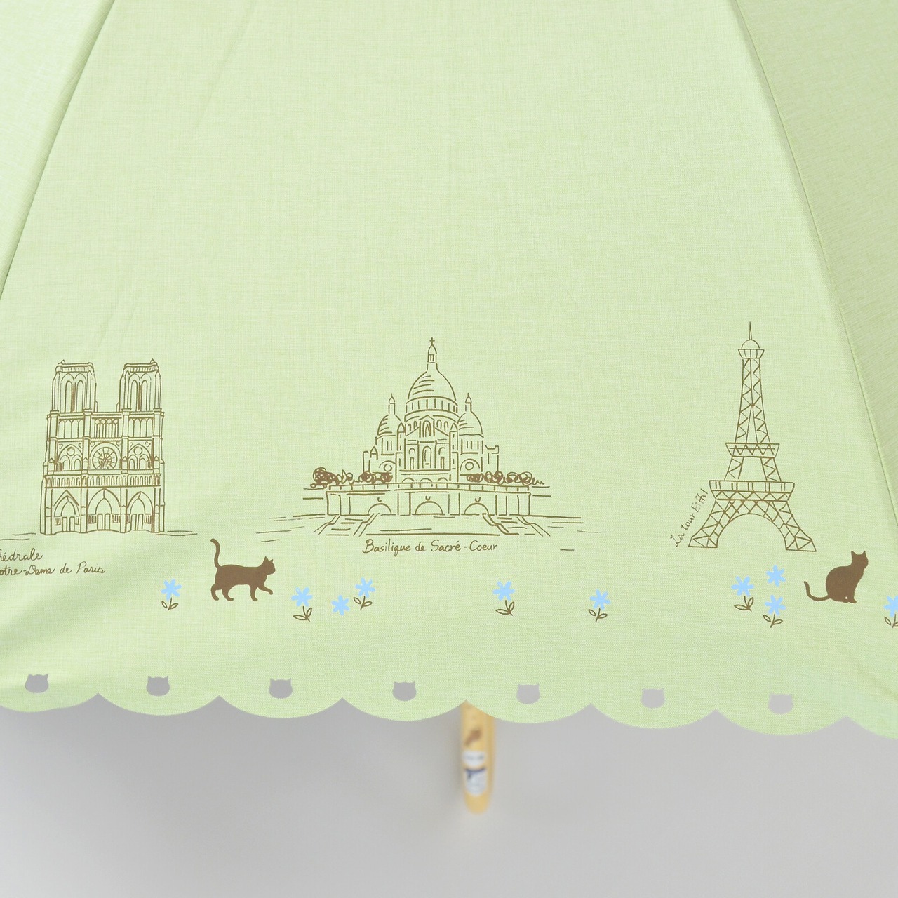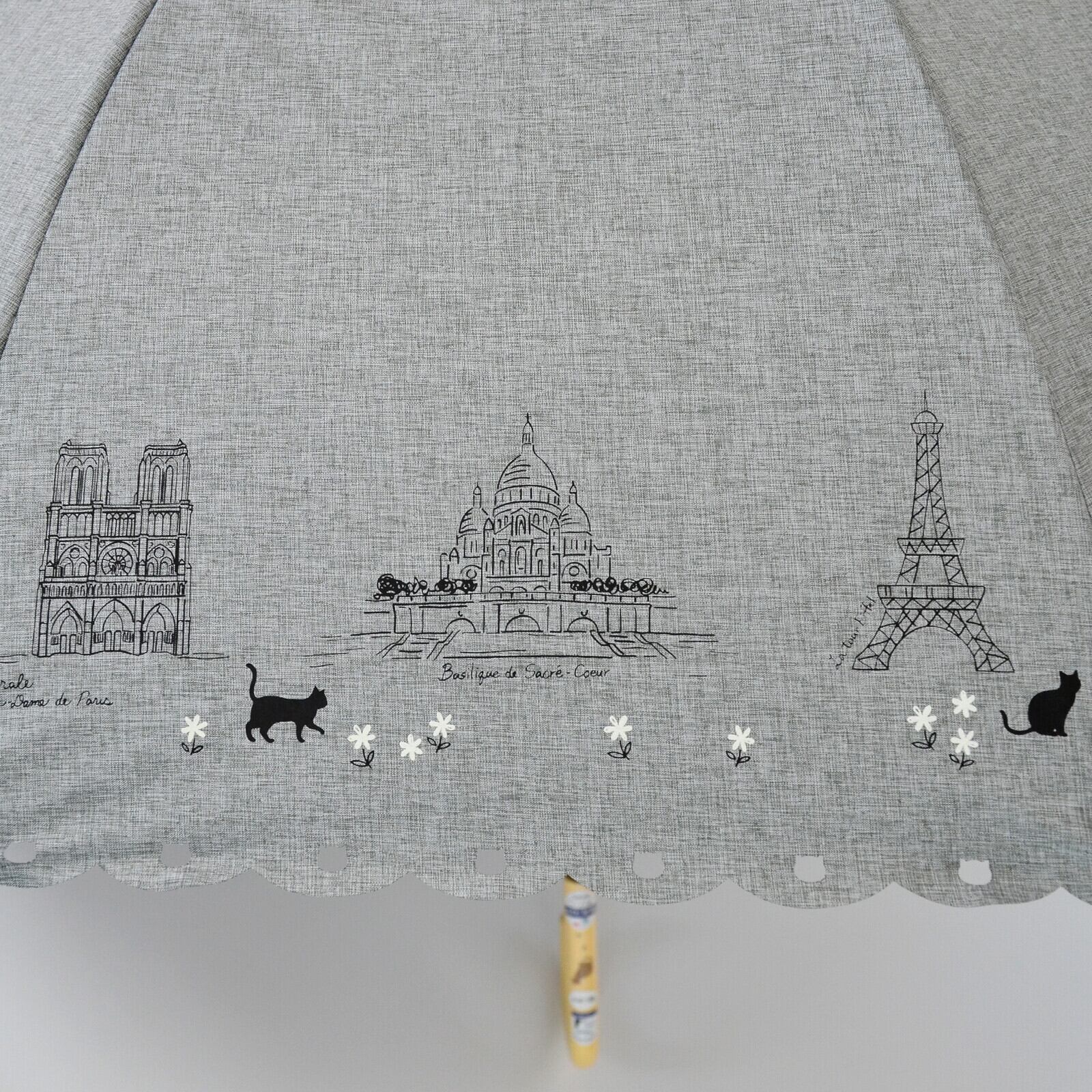 猫フェイスの型抜きヒートカット加工の裾スカラップがかわいい、人気の猫モチーフの裏ブラックコーティングの晴雨兼用傘。対面2コマにはパリの名所を巡る猫ちゃんをプリントしました! ネームバンドには猫の足あとの型押しボタン付き。持ち運びしやすい折りたたみタイプで、藤巻き曲りのハンドルは持ちやすく、夏らしく爽やか。猫いますシールもついてます。はっ水・防水加工も施されているので、とっさの雨でもお使いいただけます。