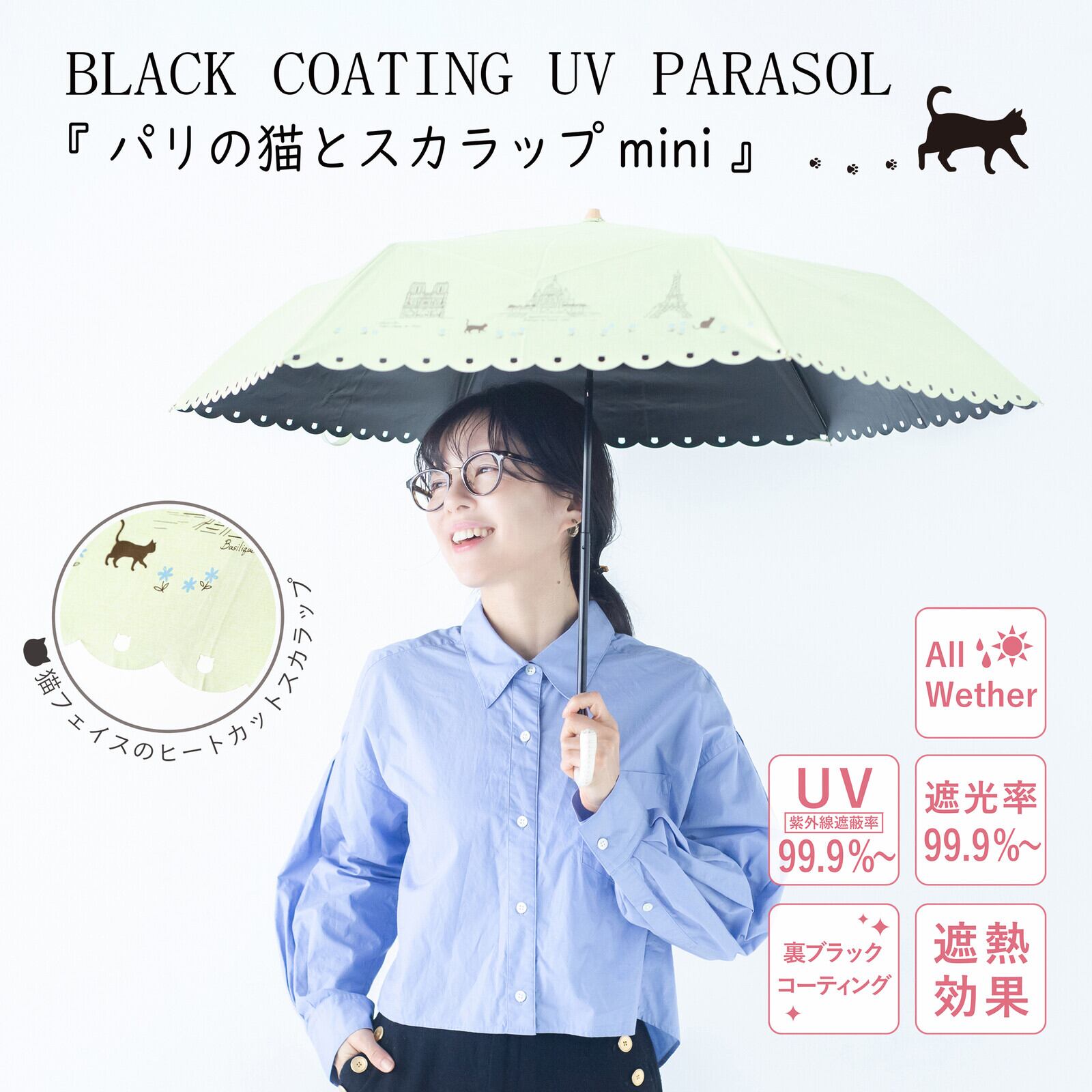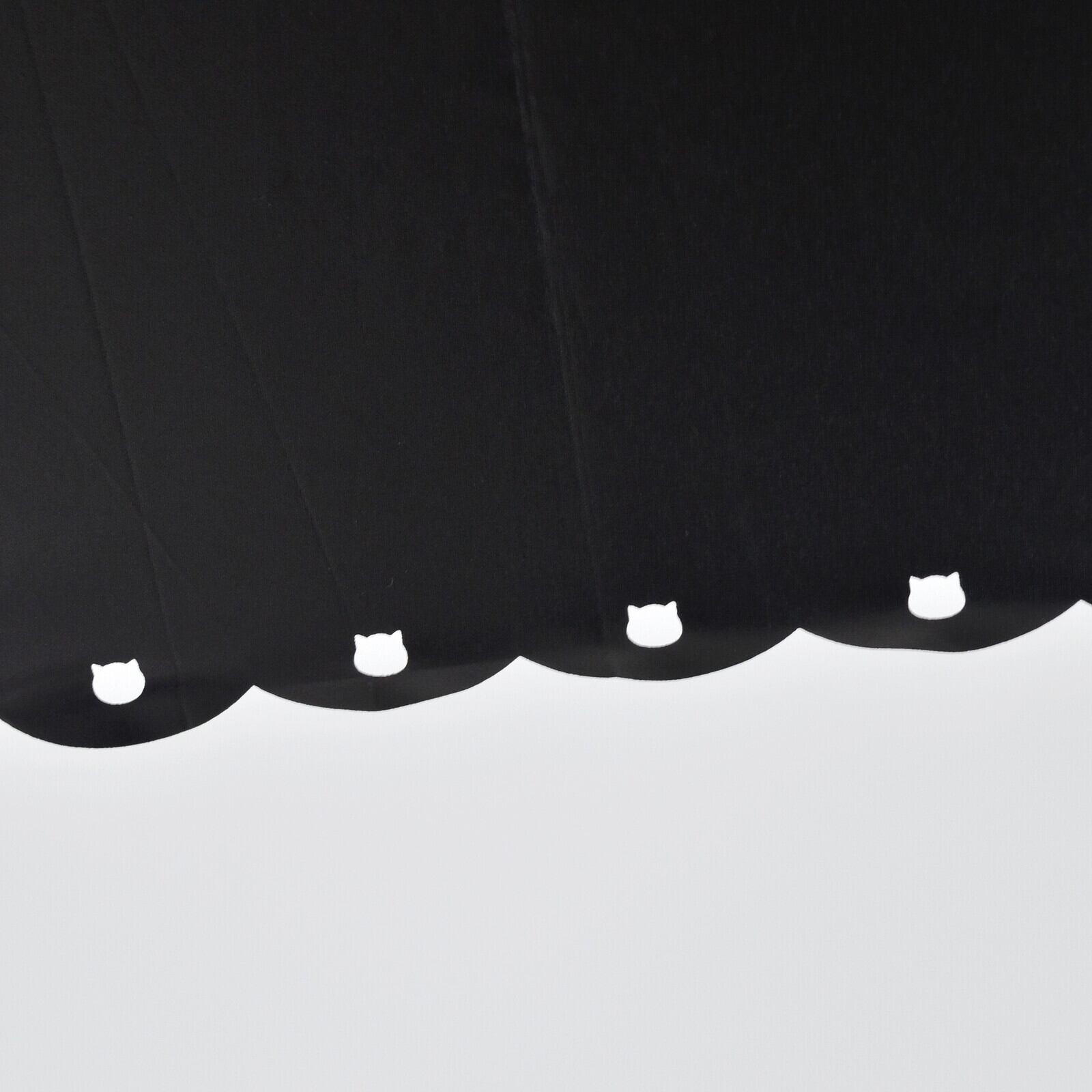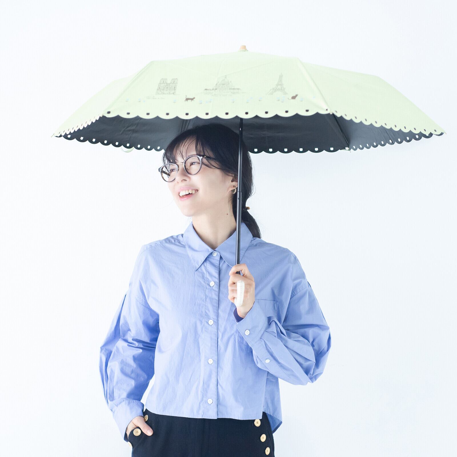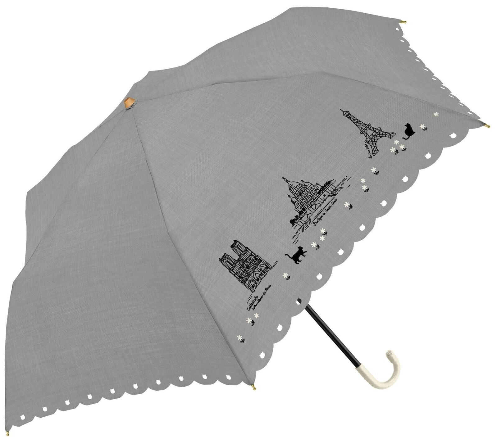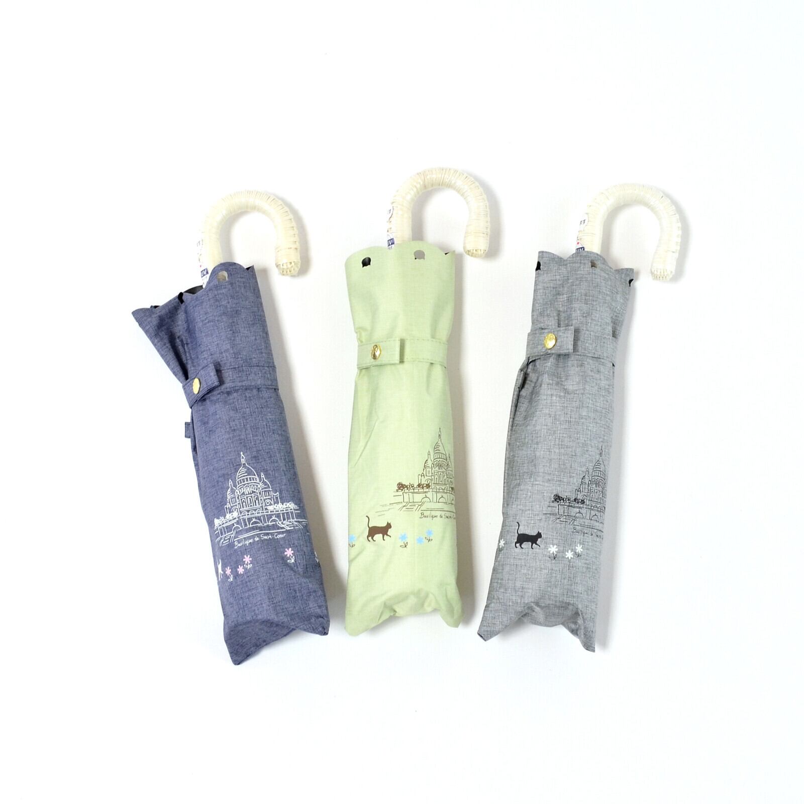 猫フェイスの型抜きヒートカット加工の裾スカラップがかわいい、人気の猫モチーフの裏ブラックコーティングの晴雨兼用傘。対面2コマにはパリの名所を巡る猫ちゃんをプリントしました! ネームバンドには猫の足あとの型押しボタン付き。持ち運びしやすい折りたたみタイプで、藤巻き曲りのハンドルは持ちやすく、夏らしく爽やか。猫いますシールもついてます。はっ水・防水加工も施されているので、とっさの雨でもお使いいただけます。
