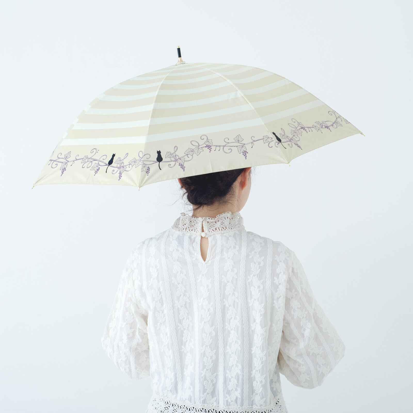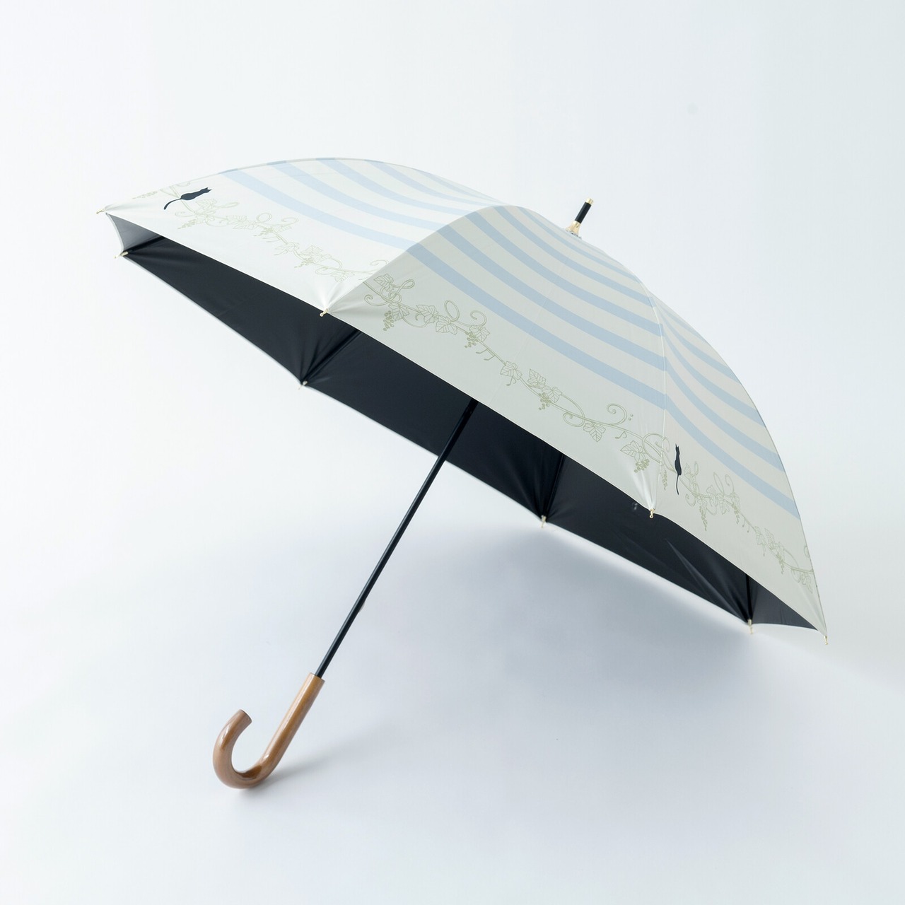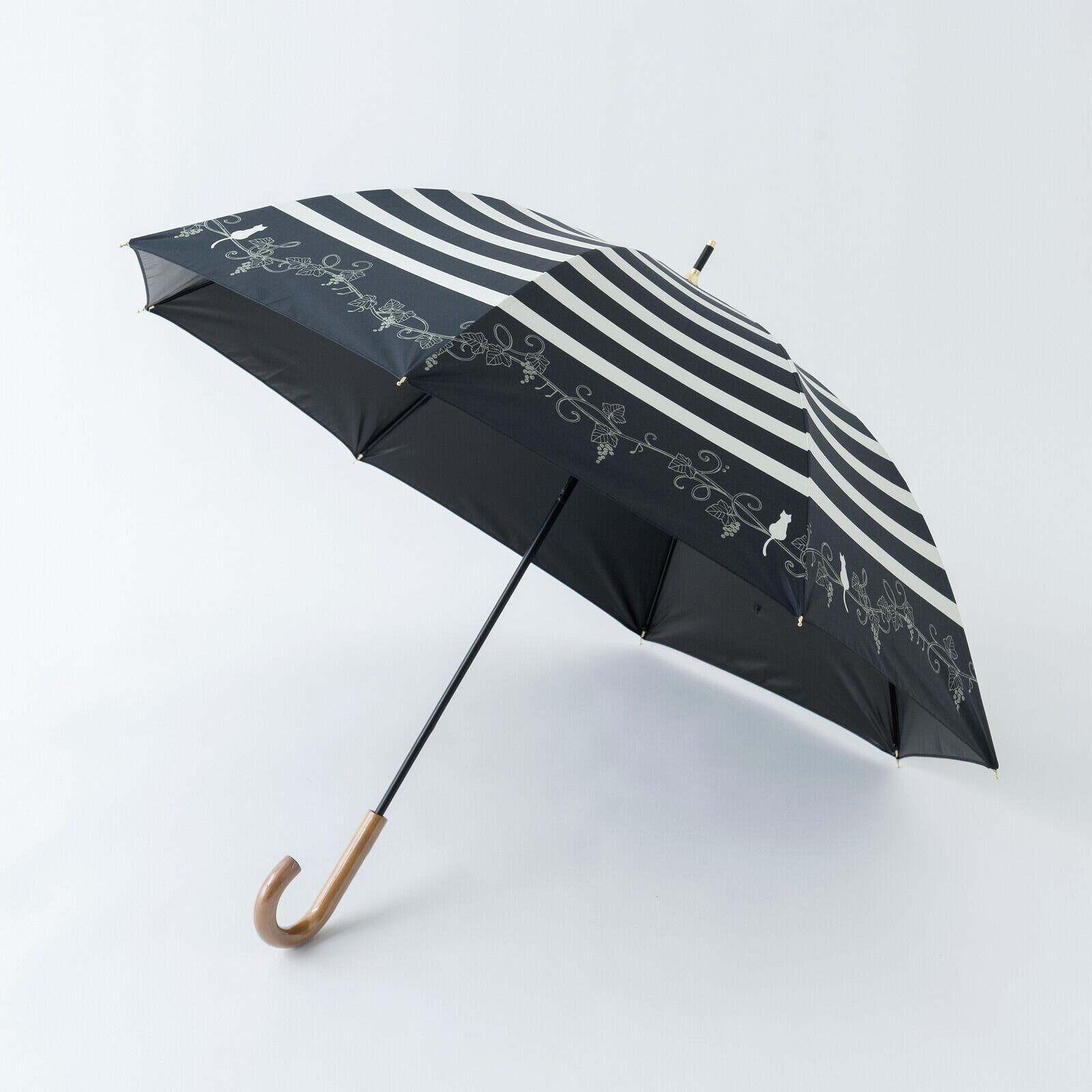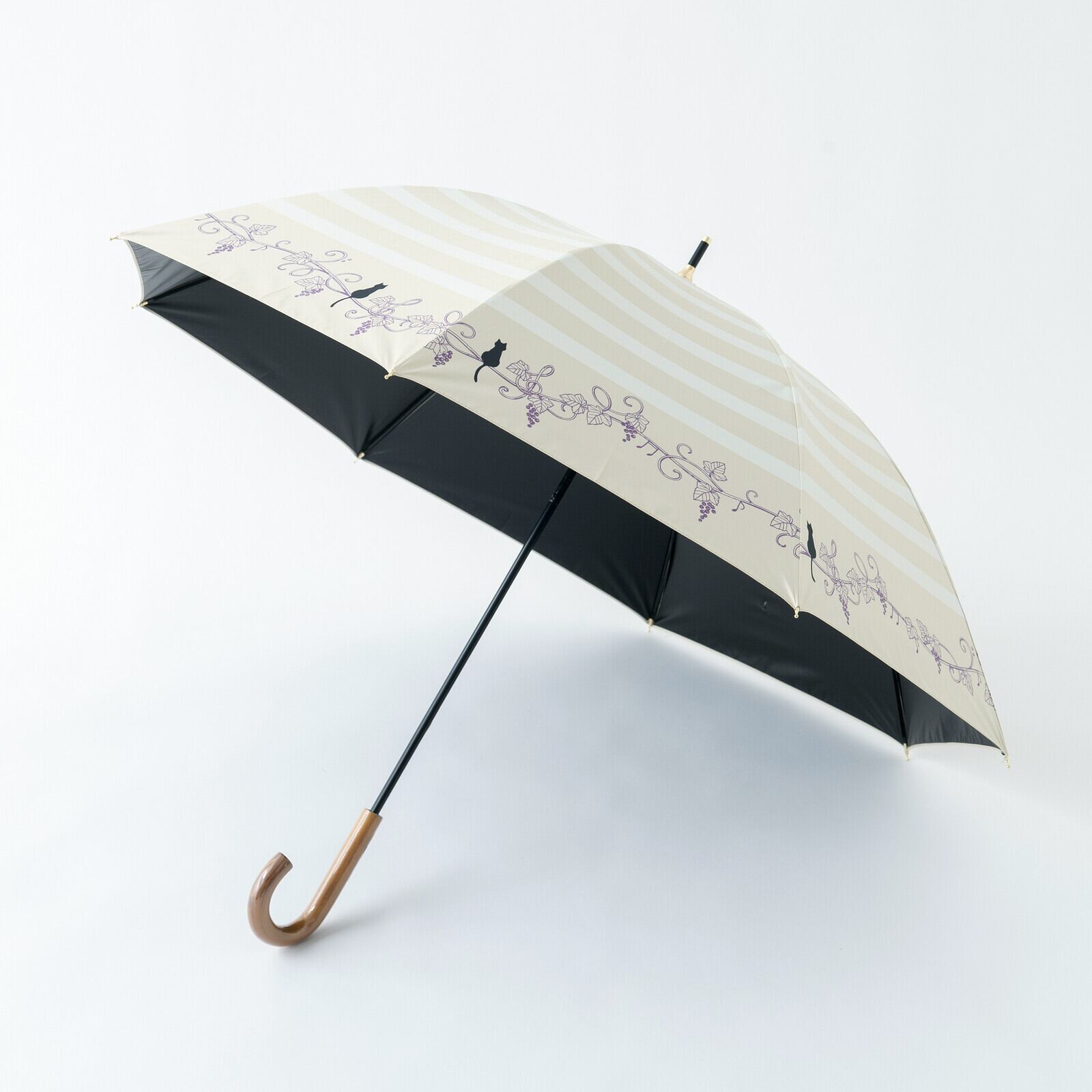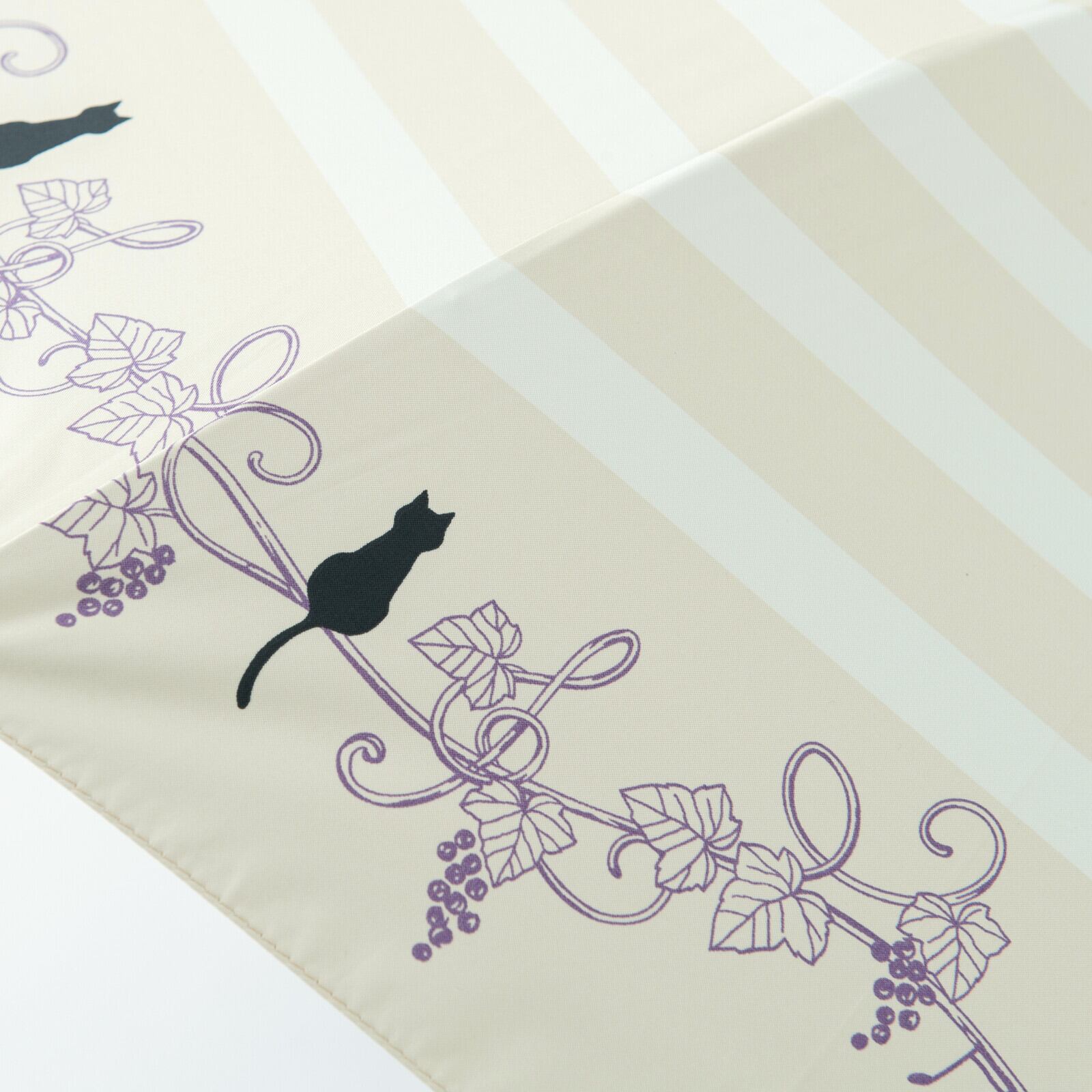 ボーダープリントに、葡萄のツタモチーフにちょこんとのっかっている猫ちゃんが大人かわいい晴雨兼用傘。この葡萄のツタがところどころト音記号やヘ音記号になっていて、♪モチーフもついてるんです!!音楽好きさんへのプレゼントとしてもぴったりなんですよ〜♪ホックボタンは猫のあしあとの型押しボタンになっています。手元ハンドルはシックな焼き加工付き木製ハンドルで、落ち着いたデザインです。