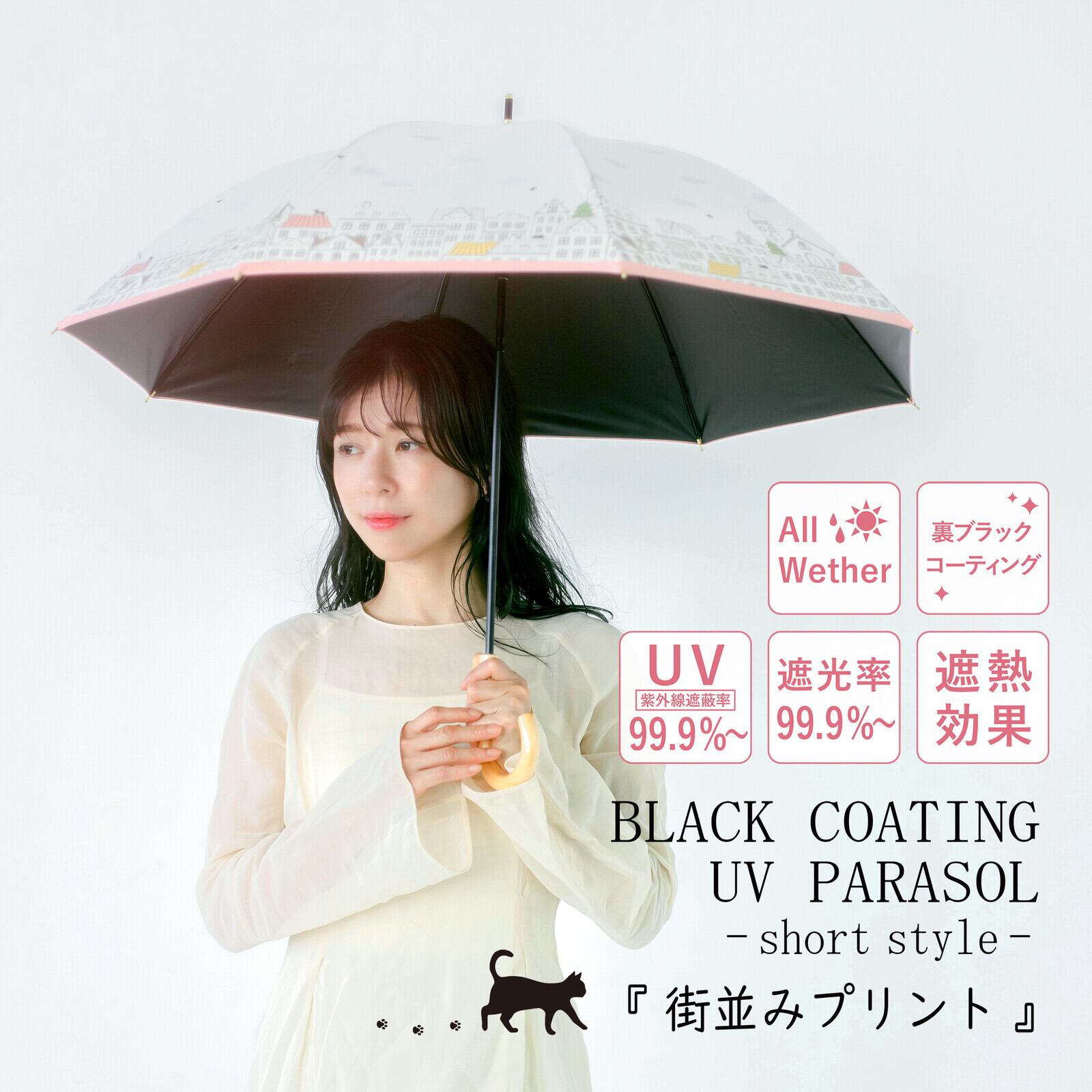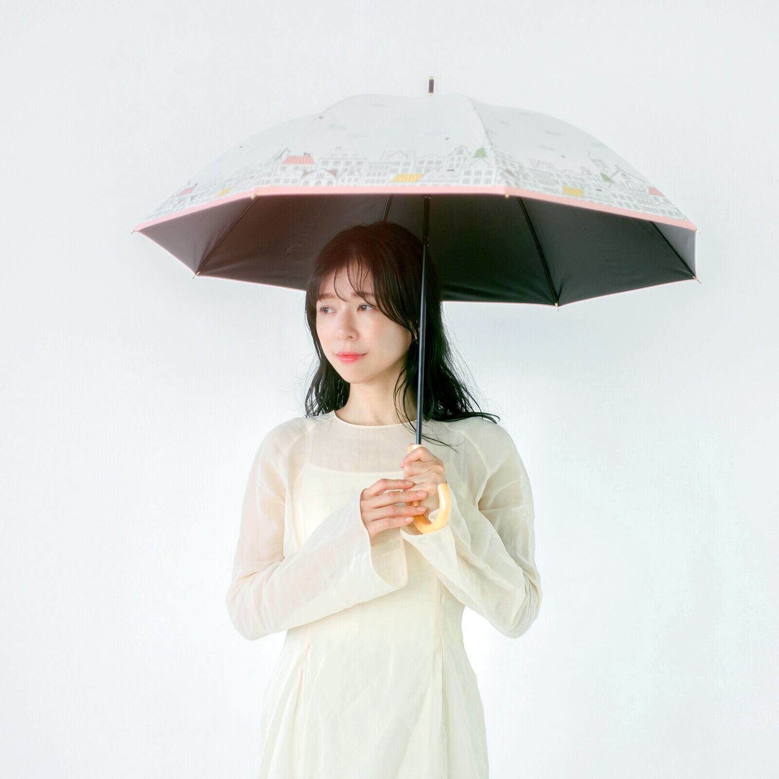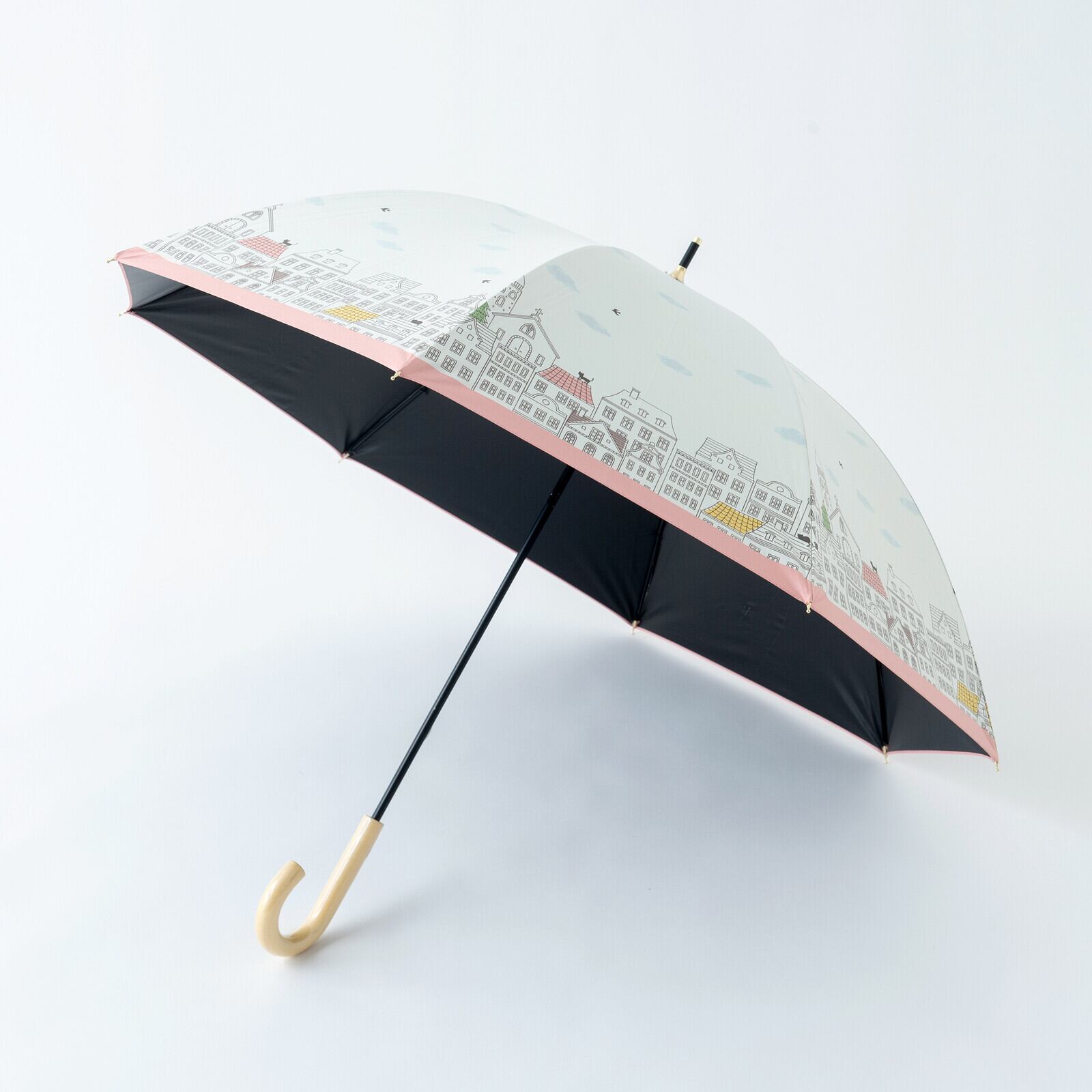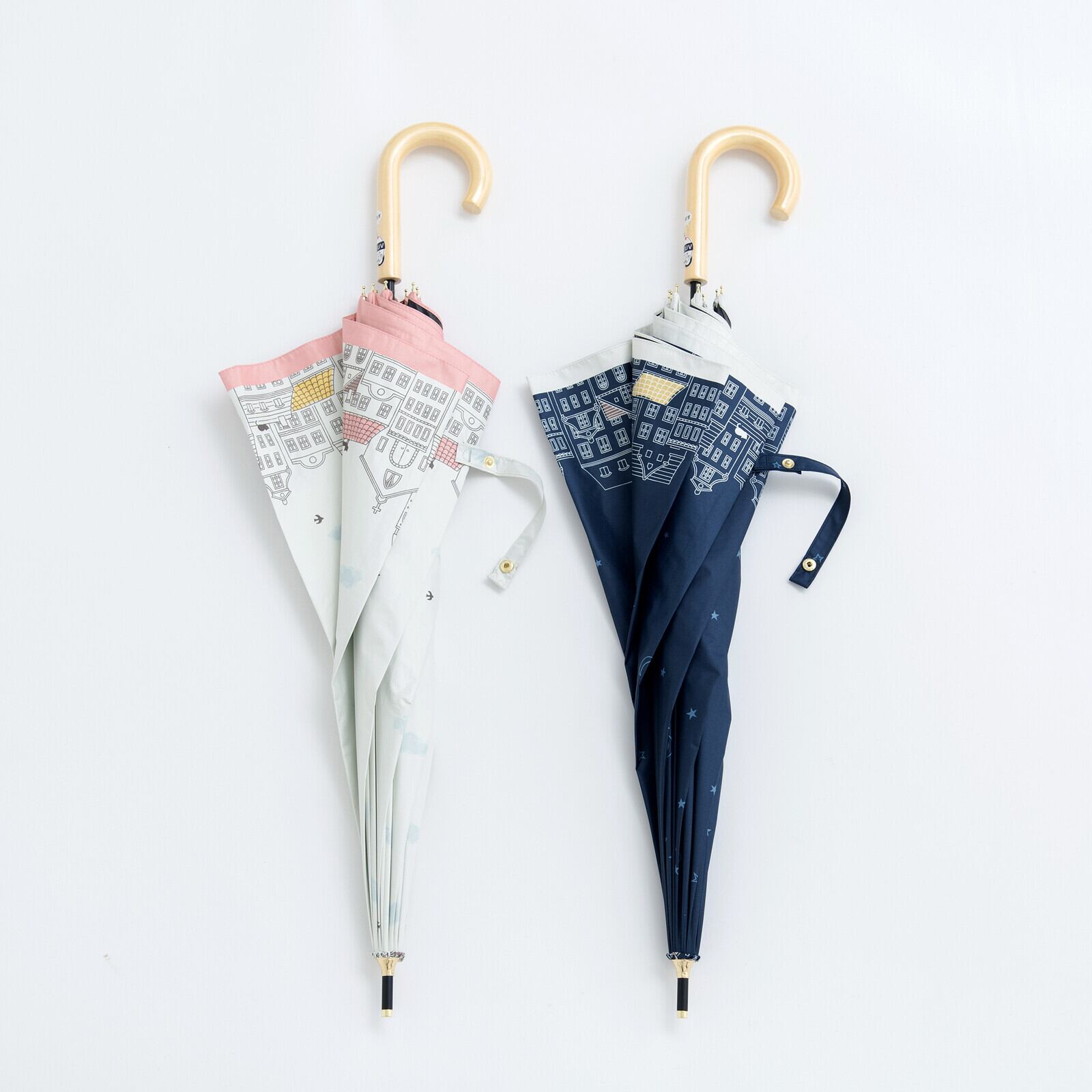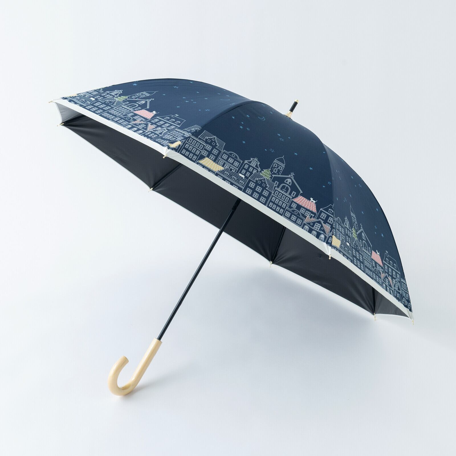 ヨーロッパの街並みが描かれた晴雨兼用傘。オフホワイトは雲が浮かんでいて昼間の街を、ネイビーは星がまたたく夜の街をプリントしました。よく見ると屋根の上には猫さん達がひっそりとたたずんでいるんですよ〜(=^・^=)ネームボタンは猫のあしあとの型押しボタンになっていて、白木の手元ハンドルがナチュラルテイストです。