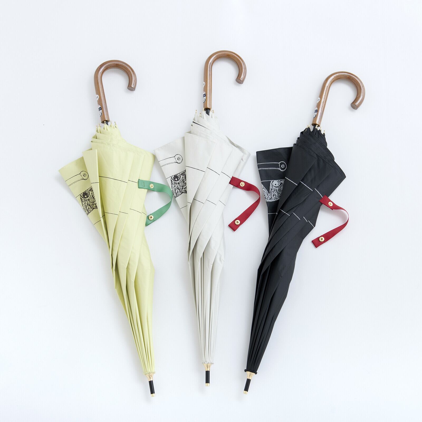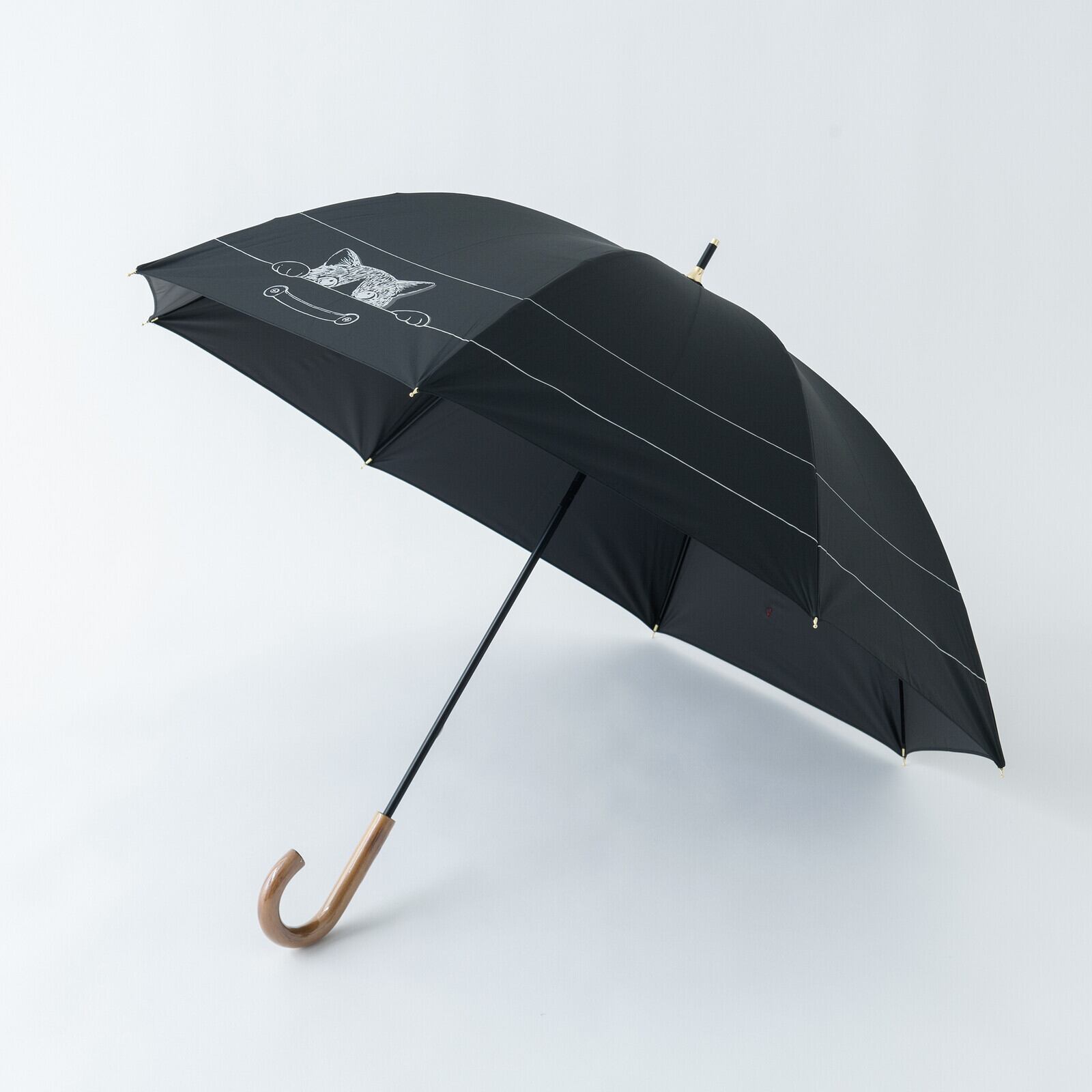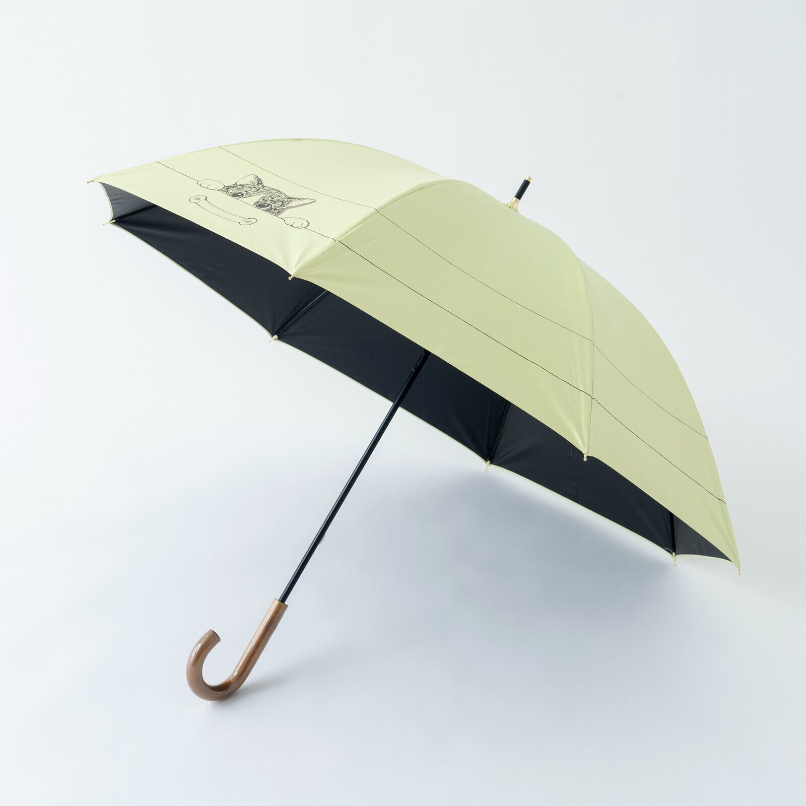 タンスの中にかくれていたいたずら好きな猫さんが、ひょっこり顔を出しているおもしろかわいいプリントの晴雨兼用傘。ネームバンドには赤&ライトグリーンのグランリボンテープを合わせてアクセントとしました。手元ハンドルは焼き加工付きの木製ハンドル&ネームボタンは猫のあしあとモチーフの型押しホックボタン付き。