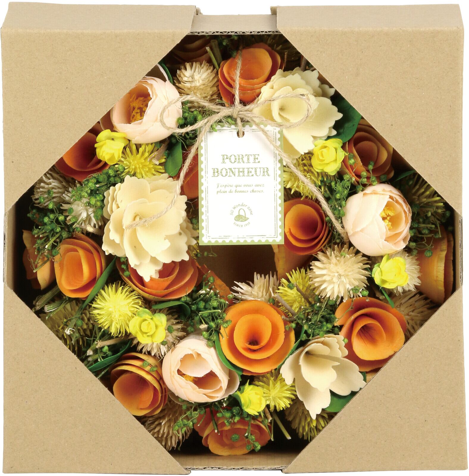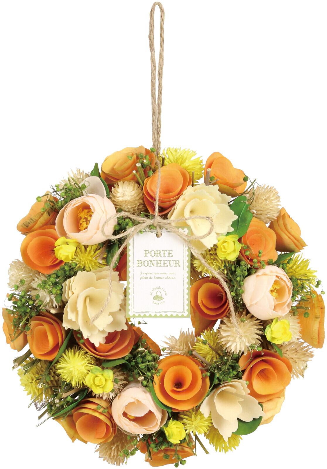 オールシーズン飾れるリースです。誕生日や新築祝いなどにいかがでしょうか。リースは玄関先リビングの壁に掛けて飾ることができおしゃれなインテリアとしてオススメです。天然素材で一つ一つ手作りで生産されているオールシーズンリースです。オールシーズンリース イエロー
